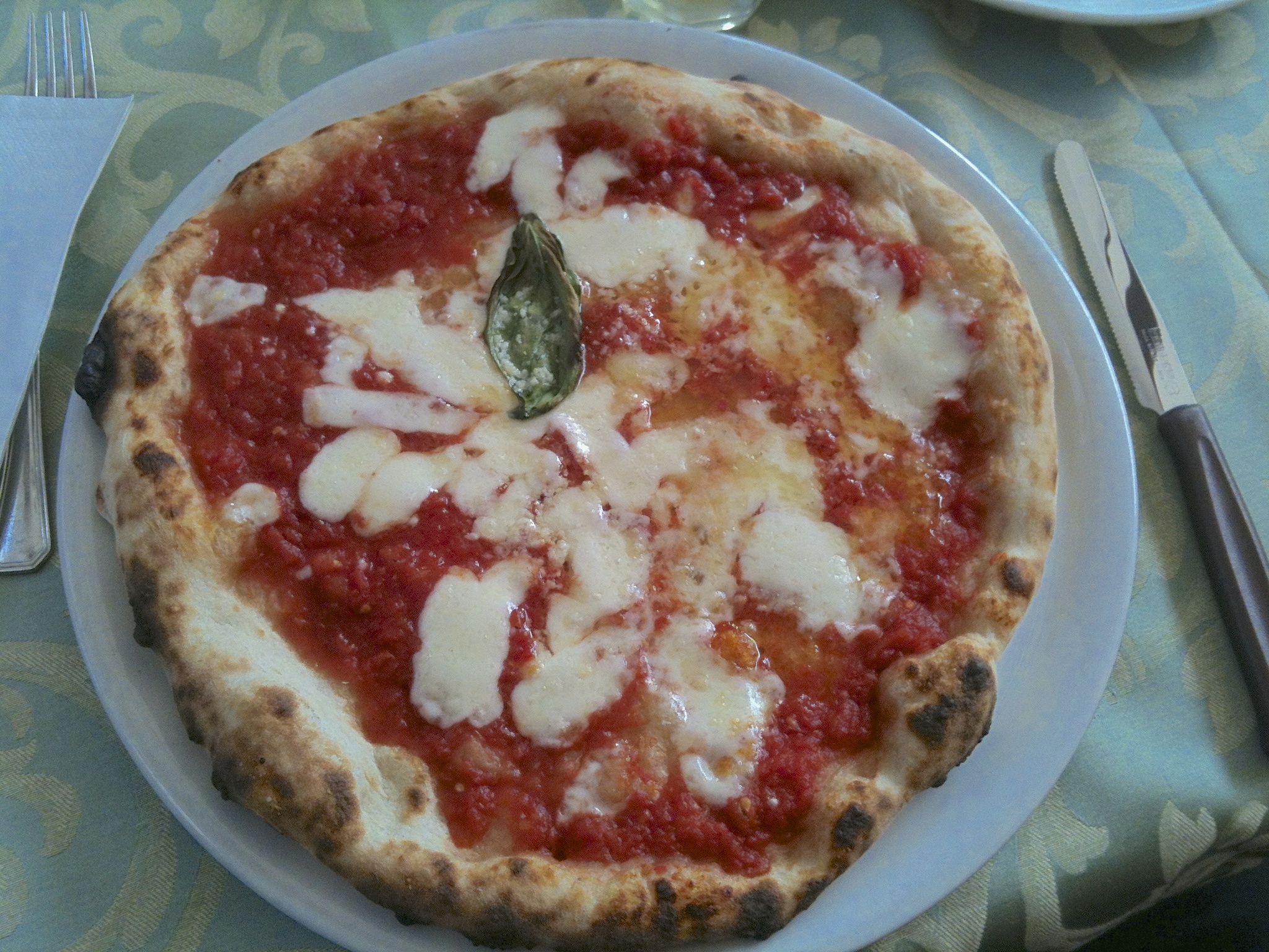 Cette pizza cuite au feu de bois conjugue deux qualités fréquentes à Naples, très rares chez nous : la légèreté croquante du pourtour et le moelleux jamais spongieux du centre. Elle se maintient dans cet état du début à la fin du repas.