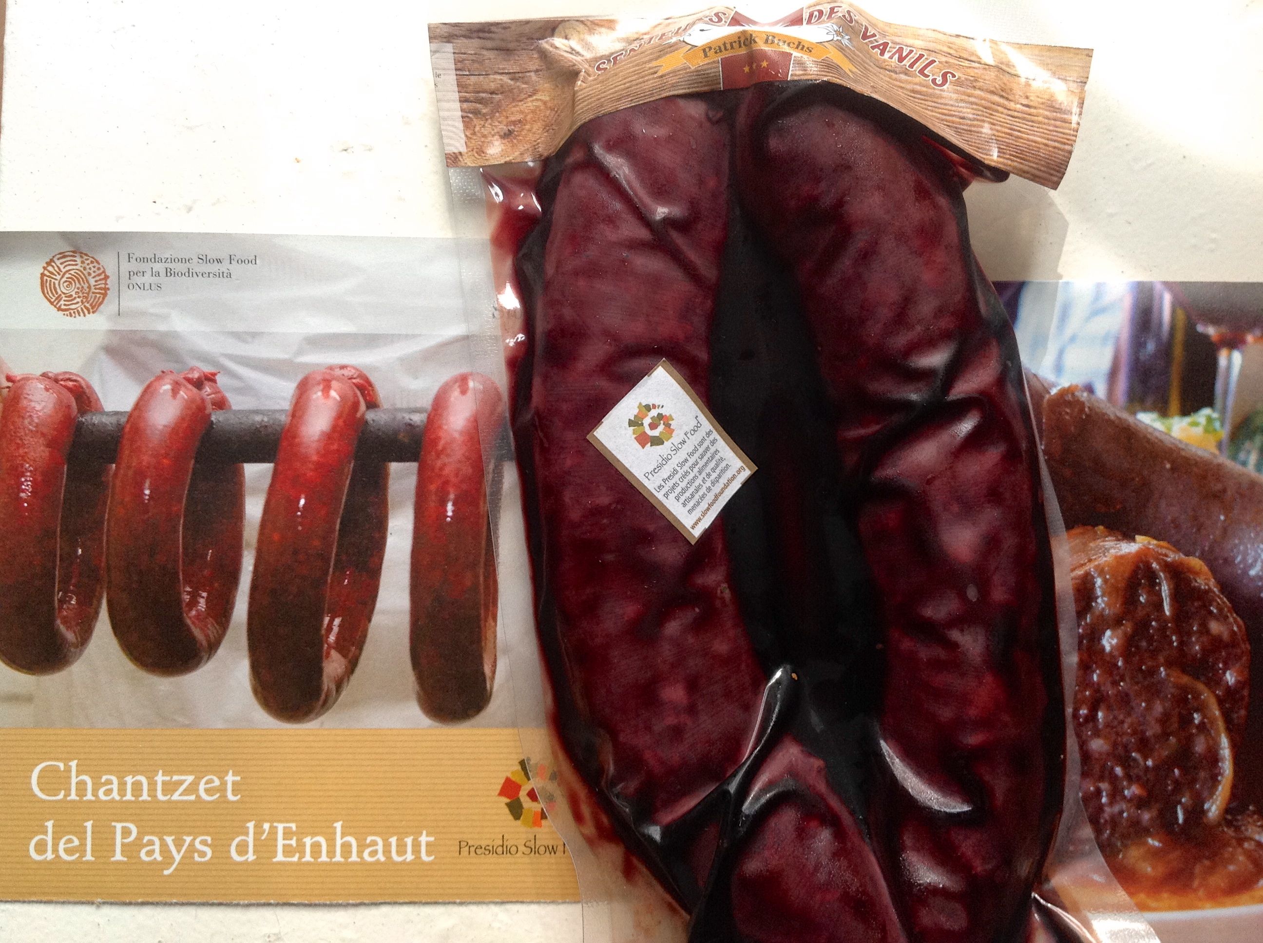 Comme plat principal, le « chantznet » du Pays d’En Haut, fabriqué par le boucher Patrick Buchs, soutenu par l’association Slow Food. Je n’ai jamais goûté ce boudin au chou mais j’en salive déjà, surtout que la saucisse sèche de boeuf aux myrtilles goûtée samedi était originale et excellente.