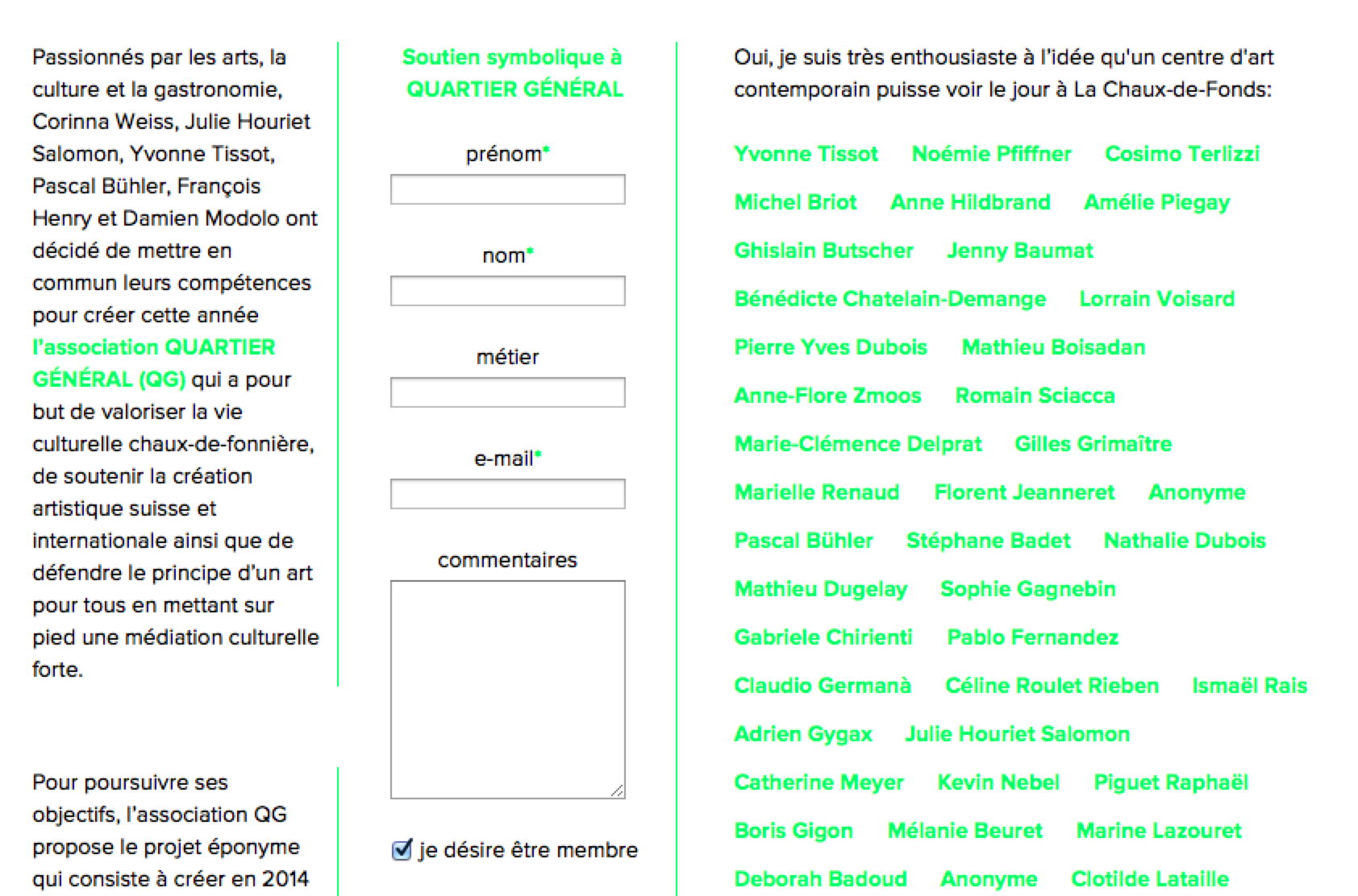 C’est avec enthousiasme que je salue la création de l’association Quartier général récemment mise en avant sur internet pour un large soutien. Son projet consiste à créer en 2014 un centre d’art contemporain, une librairie spécialisée et un café-restaurant éthique servant des produits locaux, biologiques et «faits maison» à La Chaux-de-Fonds.