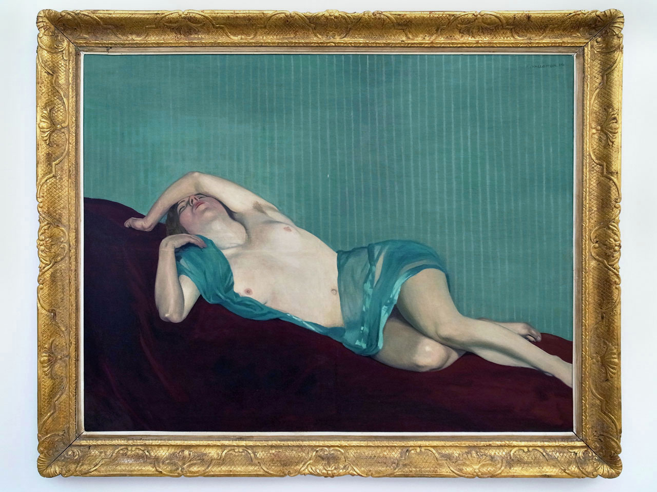 L’exposition explique bien la « dialectique de l’exhibition et de la dissimulation » en jeu chez Vallotton, ici magistralement mise en scène dans l’opposition entre la rigueur du fond vert strié et la volupté du tissu rouge. Le corps se donne à voir dans un jeu entre la disponibilité et la réserve; le peintre spectateur un peu misogyne sait qu’aucun regard ne doit empêcher « la pleine possession de ces femmes vulnérables et disponibles, observées dans la convention d’une fausse effraction, dans l’excitation de l’interdit. » (Laurence des Cars). Notre belle a les paupières closes, mais pas nous qui l’observons dans la « convention d’une fausse effraction ».