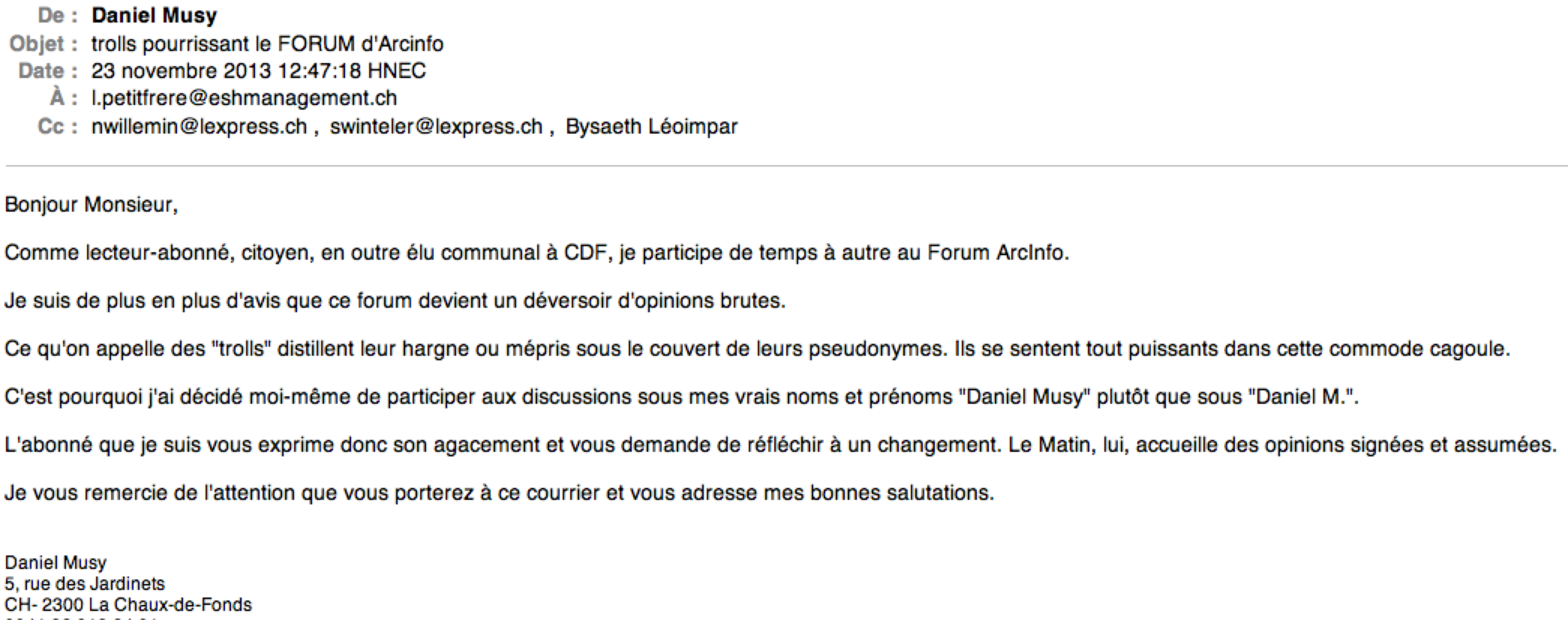 C’est la raison pour laquelle j’ai envoyé, principalement comme abonné-lecteur, le courriel suivant au rédacteur en chef de l’espace internet d’ArcInfo, avec copie à la rédaction en chef.