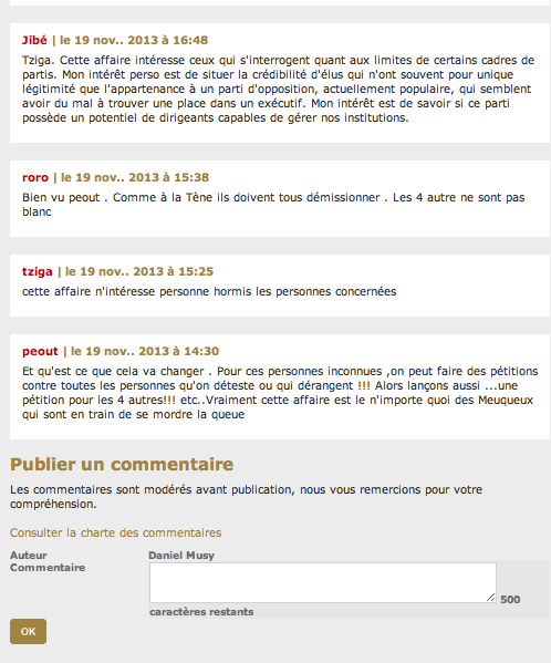 Un exemple, justement à propos cette pétition où on retrouve « roro » et « peout » sous le couvert de leur pseudonyme. D’autres trolleurs comme « dubas » déversent régulièrement leur haine des Chaux-de-Fonniers sur le forum. Il y a bien aussi parfois « Platon » qui replace le débat à la hauteur qu’il faut !