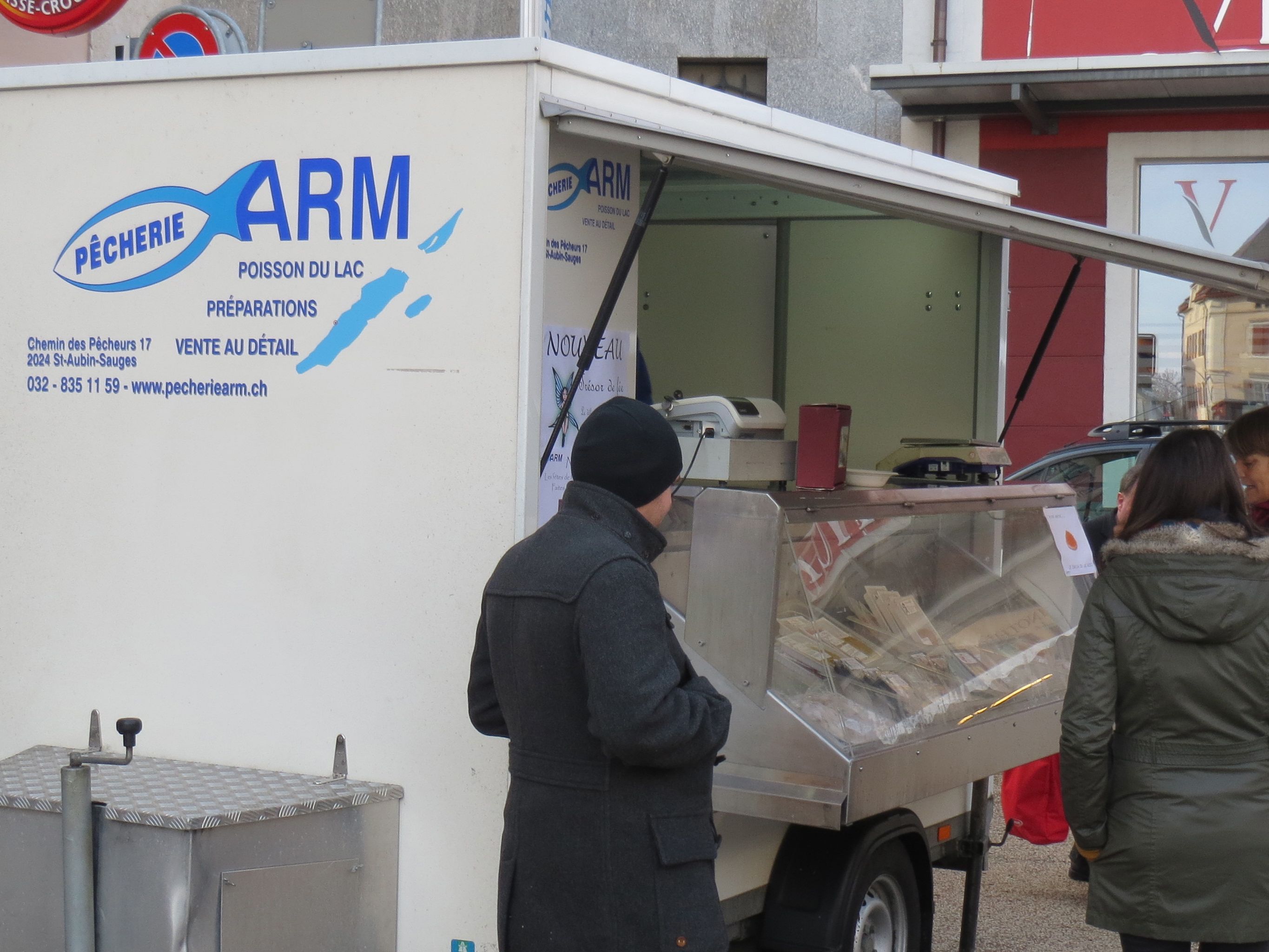 Commençons devant l’Impartial-Figaro par la petite caravane de la pêcherie Arm de Sant Aubin qui propose ses poissons du lac (palée, omble, brochet, perches) et ses préparations fumées ou cuisinées.