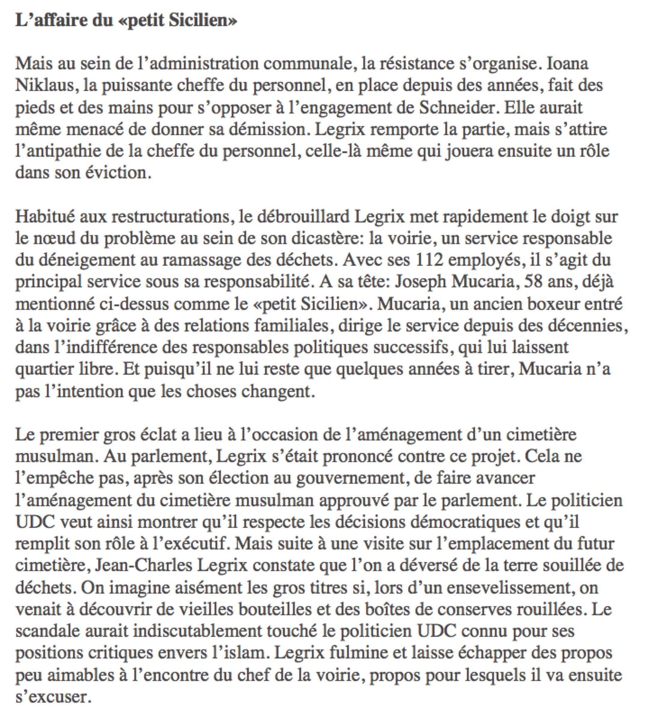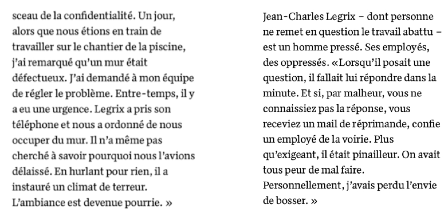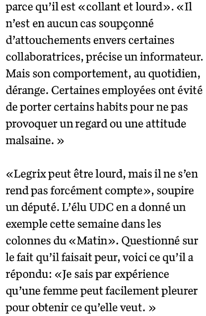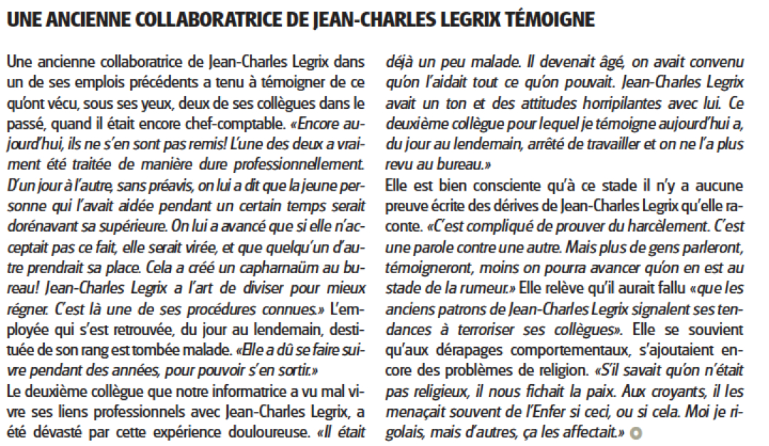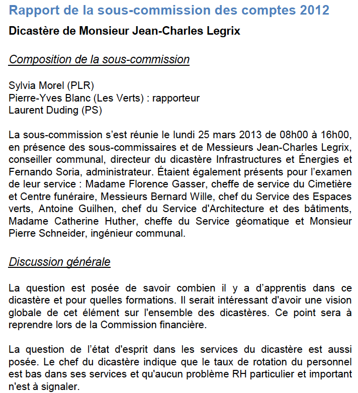 1) L’affaire Legrix commence publiquement le lundi 25 mars lors de la séance de la sous-commission financière où lui est posée une question sur « l’état d’esprit » dans son dicastère. Sa réponse est « qu’aucun problème RH [au niveau des ressources humaines] particulier et important n’est à signaler« . Pourtant la nécessité d’un audit dans son dicastère va se poser peu après.