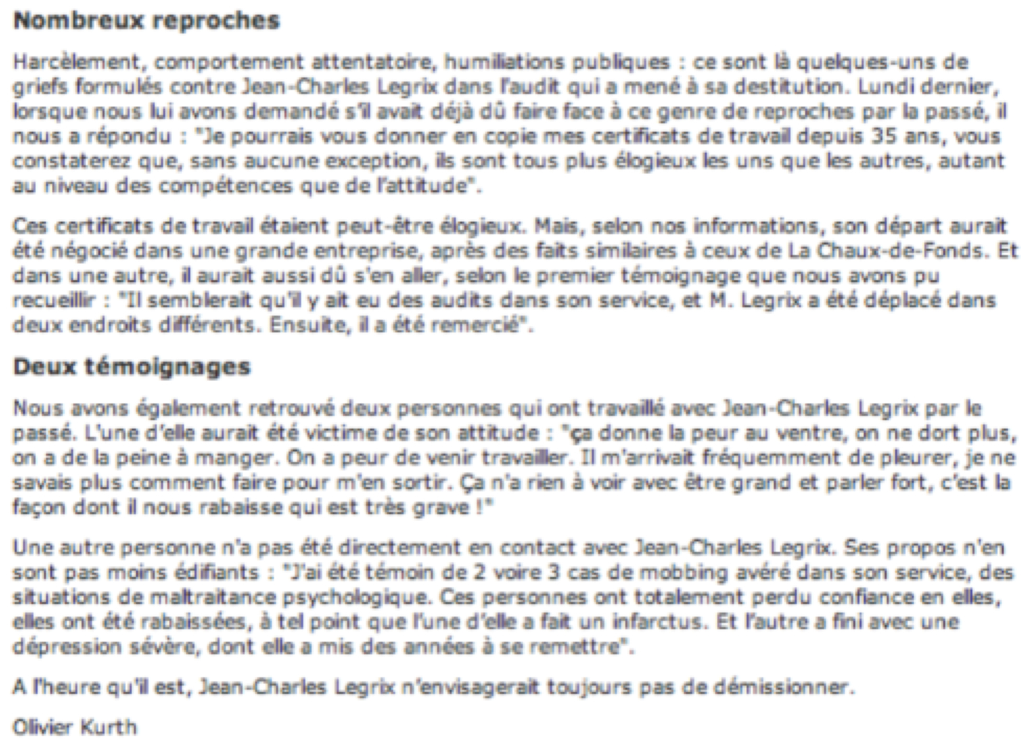 4) Après la mise à l’écart de JCL le 16 août, Olivier Kurth, de la Télévision romande, fait le 23 août un papier en recueillant lui aussi des témoignages d’anciens collaborateurs et en se distançant des certificats de travail élogieux que l’élu brandit pour sa défense. Il n’a aujourd’hui pas porté plainte contre Olivier Kurth.