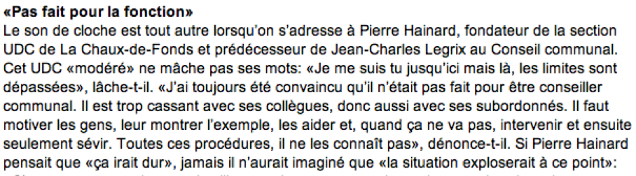 5) Le 23 août, Claude Grimm du Courrier, contre laquelle JCL n’a aujourd’hui pas porté plainte, lui consacre un long article qui voit d’abord son collègue de parti Pierre Hainard, ancien conseiller communal, déplorer la manière dont JCL dirige son dicastère :