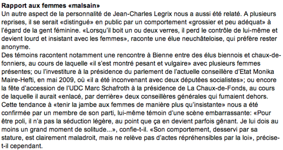 L’article insiste aussi sur les débordements inconvenants de l’élu UDC lors de soirées officielles :