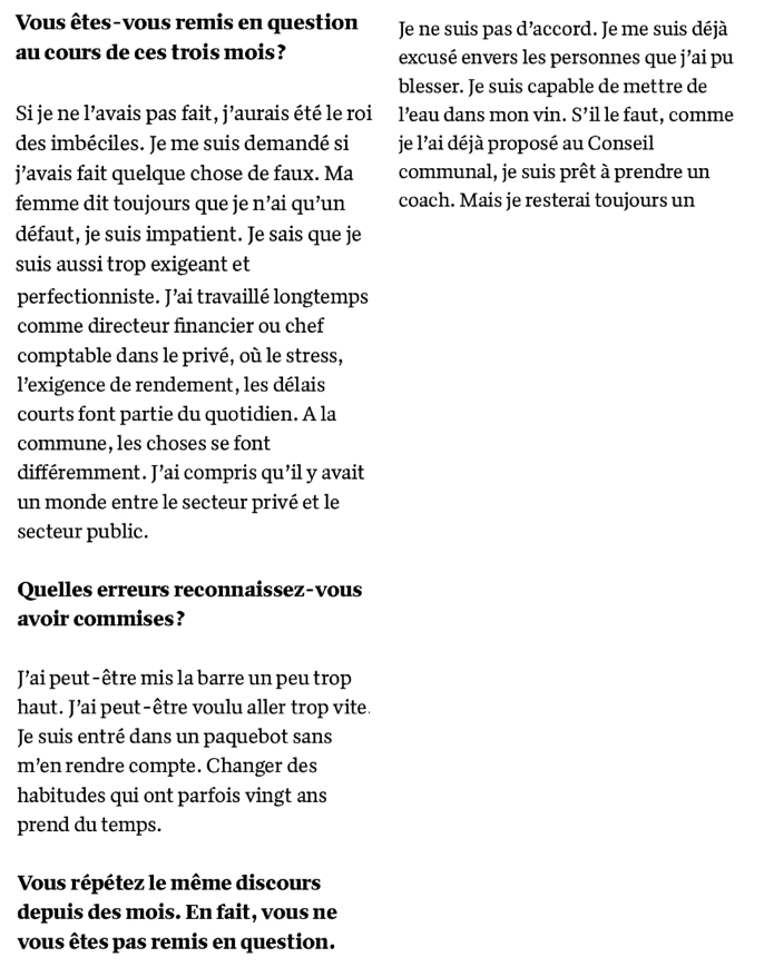 10) Les aveux se précisent dans le Matin dimanche du 1er décembre. Le même journaliste que le 25 août, Fabiano Citroni, interroge JCL. L’élu déclare s’être « déjà excusé devant les personnes que j’ai pu blesser » et est « prêt à prendre un coach ». Il se dit capable de « mettre de l’eau dans son vin », affirme s’être remis en question et avoir compris « qu’il y avait un monde entre le secteur privé et le secteur privé ». Il reconnaît avoir « peut-être voulu aller trop vite ».