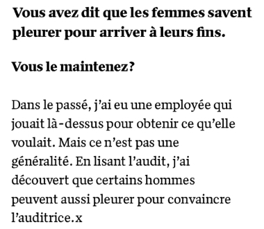 L’article se termine par une phrase anthologique sur les collaborateurs masculins qui ont pleuré durant leur audition par Mme Pache :