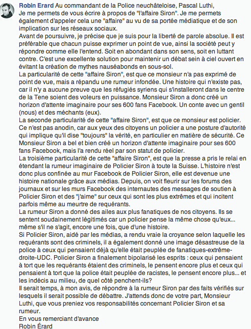 Être sur Facebook avec 600 amis oblige l’internaute réfléchi à considérer que tout ce qu’il y écrit est public et ne l’engage pas simplement comme personne privée mais comme acteur public, d’autant qu’en l’occurrence M. Siron est président du syndicat cantonal des policiers. Robin Erard a très bien analysé les regrettables effets du « post » du « policier Siron ».