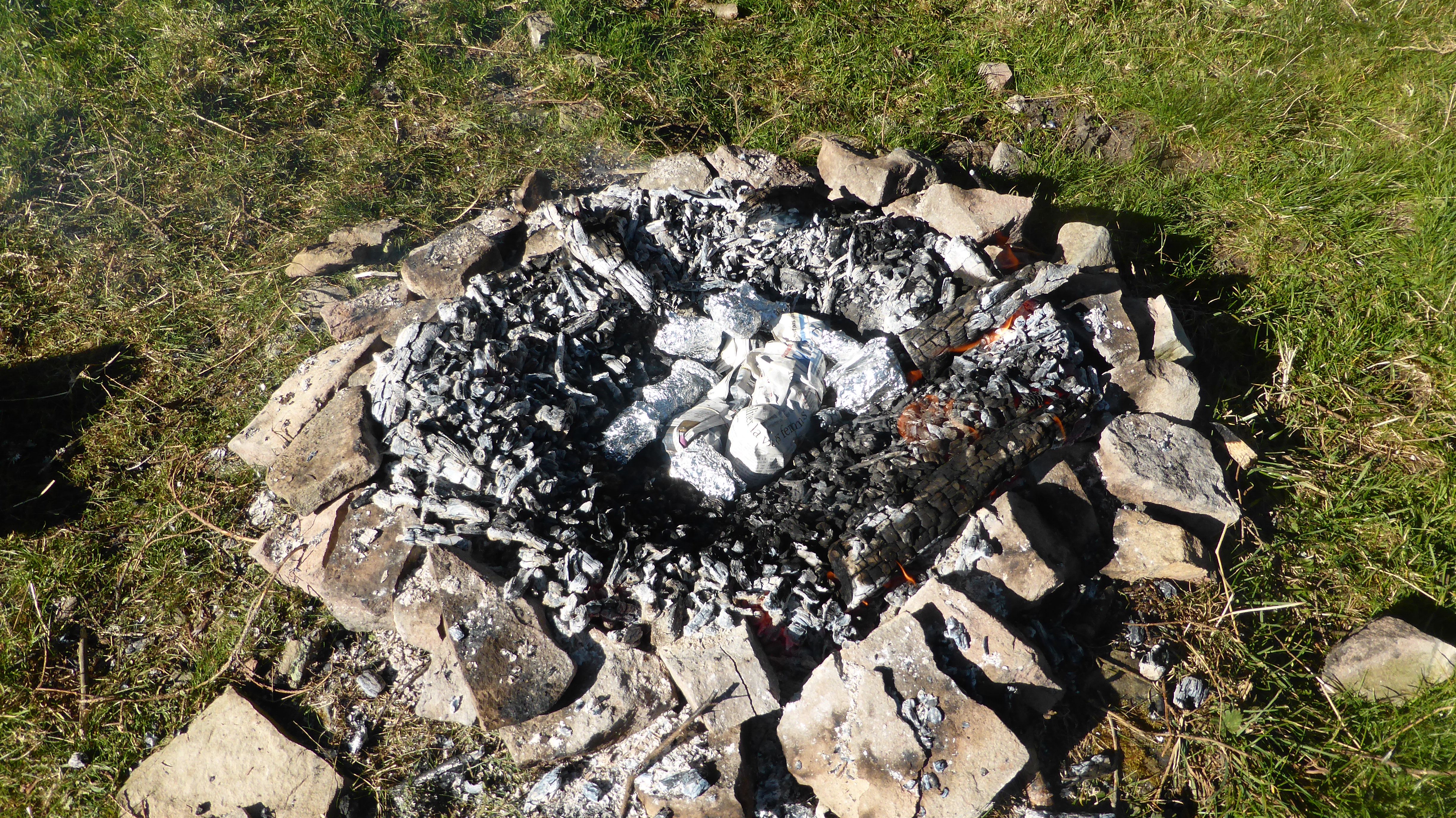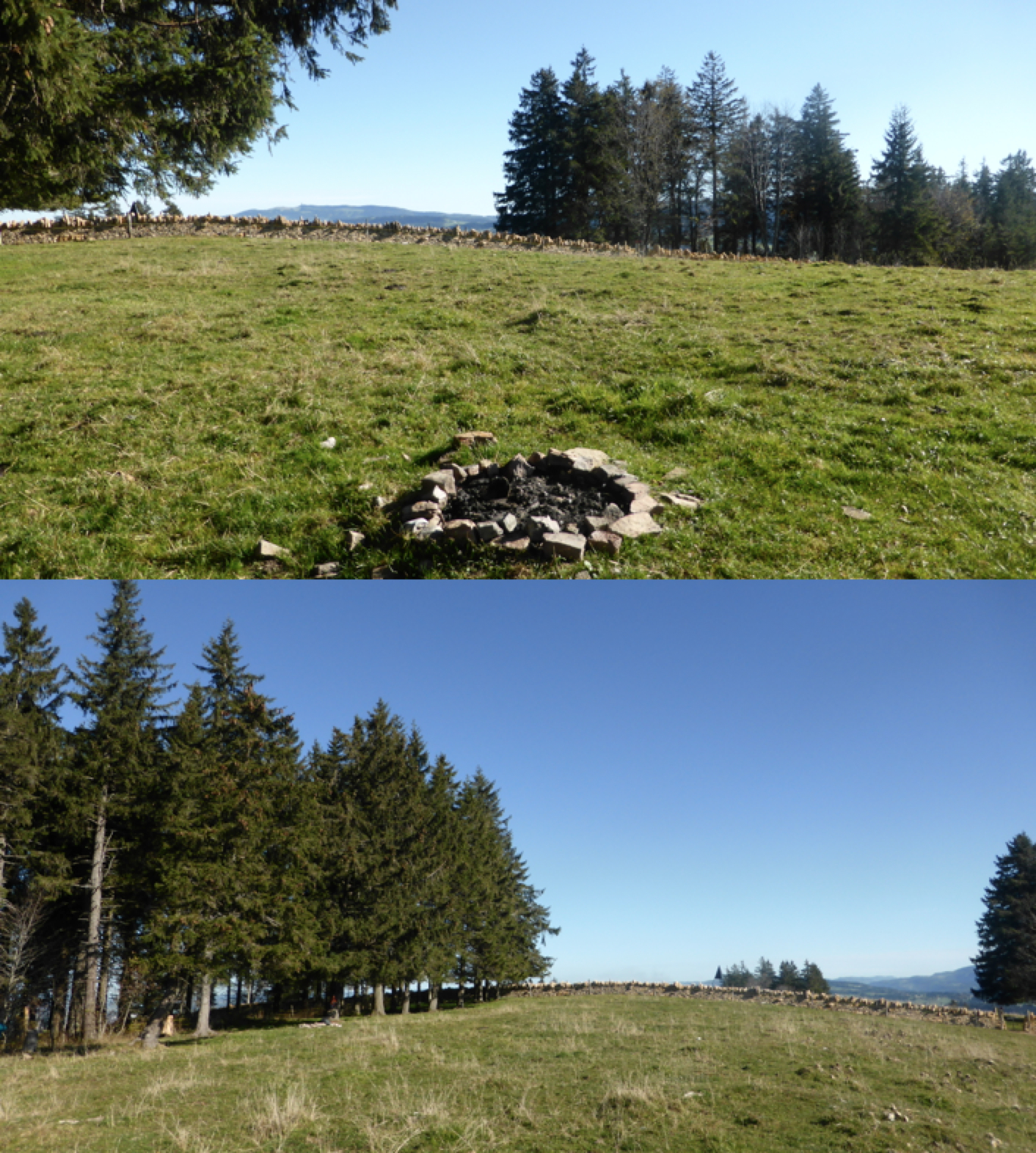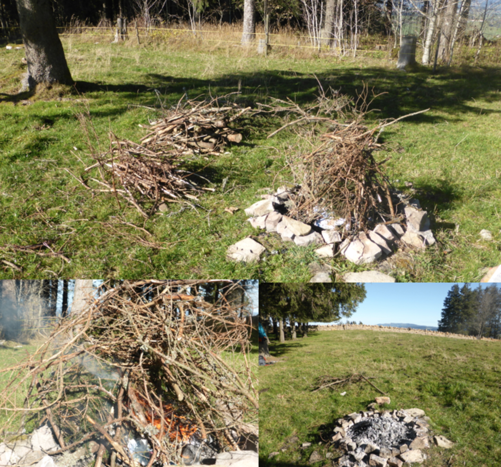 Devant une petite forêt récemment déboisée en partie on trouve un foyer en pierres sèches adéquat pour faire brûler des branches de sapin qui vont se réduire en cendres.