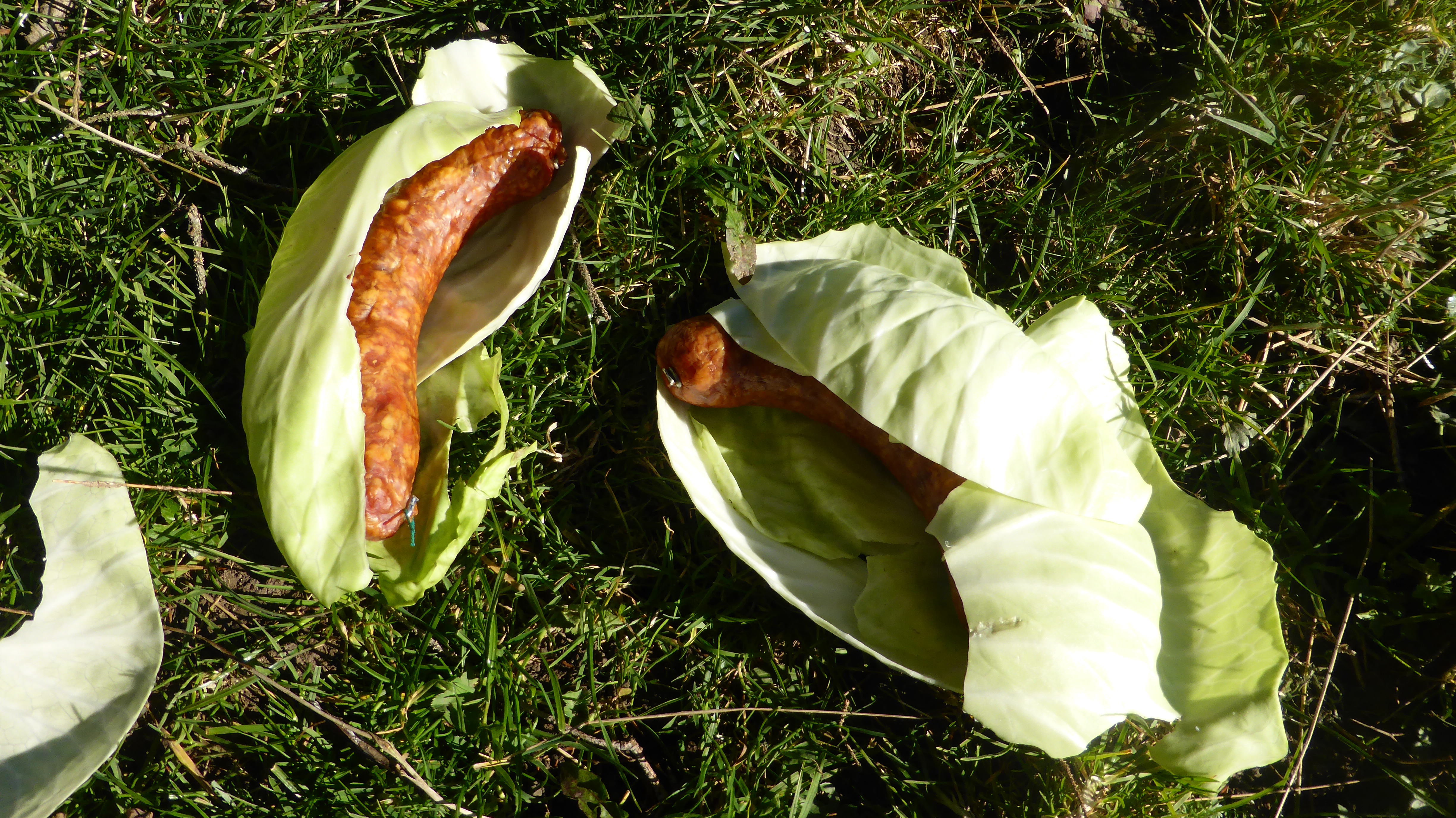 Pendant l’heure qu’il faudra au feu pour produire de belles cendres chaudes, on prépare les saucisses neuchâteloises qui vont être cuites sous la cendre. Produites dans la vallée des Ponts-de-Martel, elles bénéficient d’un label IGP (indication géographique protégée). Il faut les préparer de manière minutieuse, d’abord en les enveloppant de feuilles de chou qui leur permettront de rester juteuses à la sortie de la cuisson.