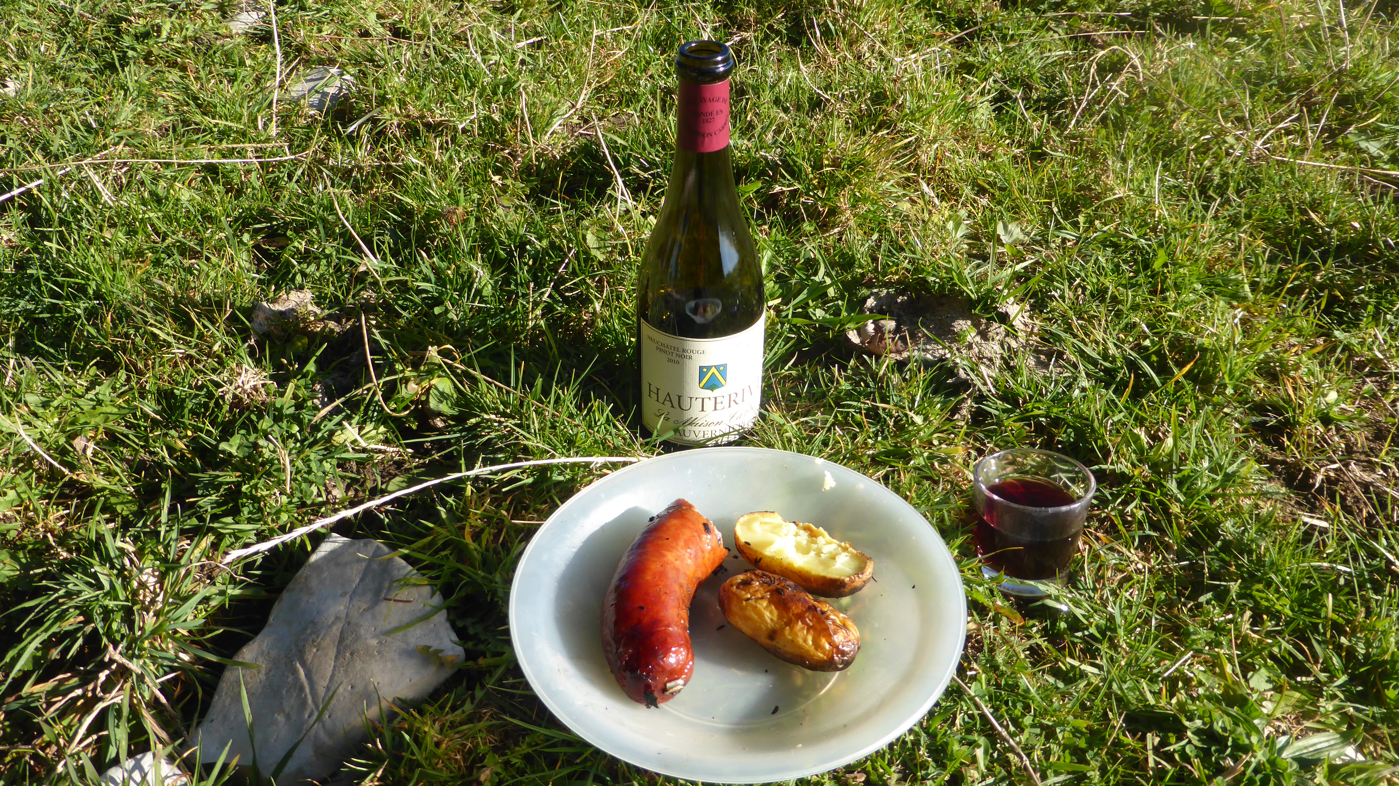 C’est alors l’apothéose, la torrée dans l’assiette, sur la couverture posée sur l’herbe fraîche avec quelques verres d’un pinot noir de la Maison carrée. La saucisse est croquante et juteuse de son gras imprégné de saveur de chou, les pommes de terre à la peau craquante fondent dans la bouche. Le soleil d’automne tape un peu sur le front, le Mont-Blanc se profile un peu plus à l’horizon, la légère bise apporte sur nous les fumées ultimes du foyer.