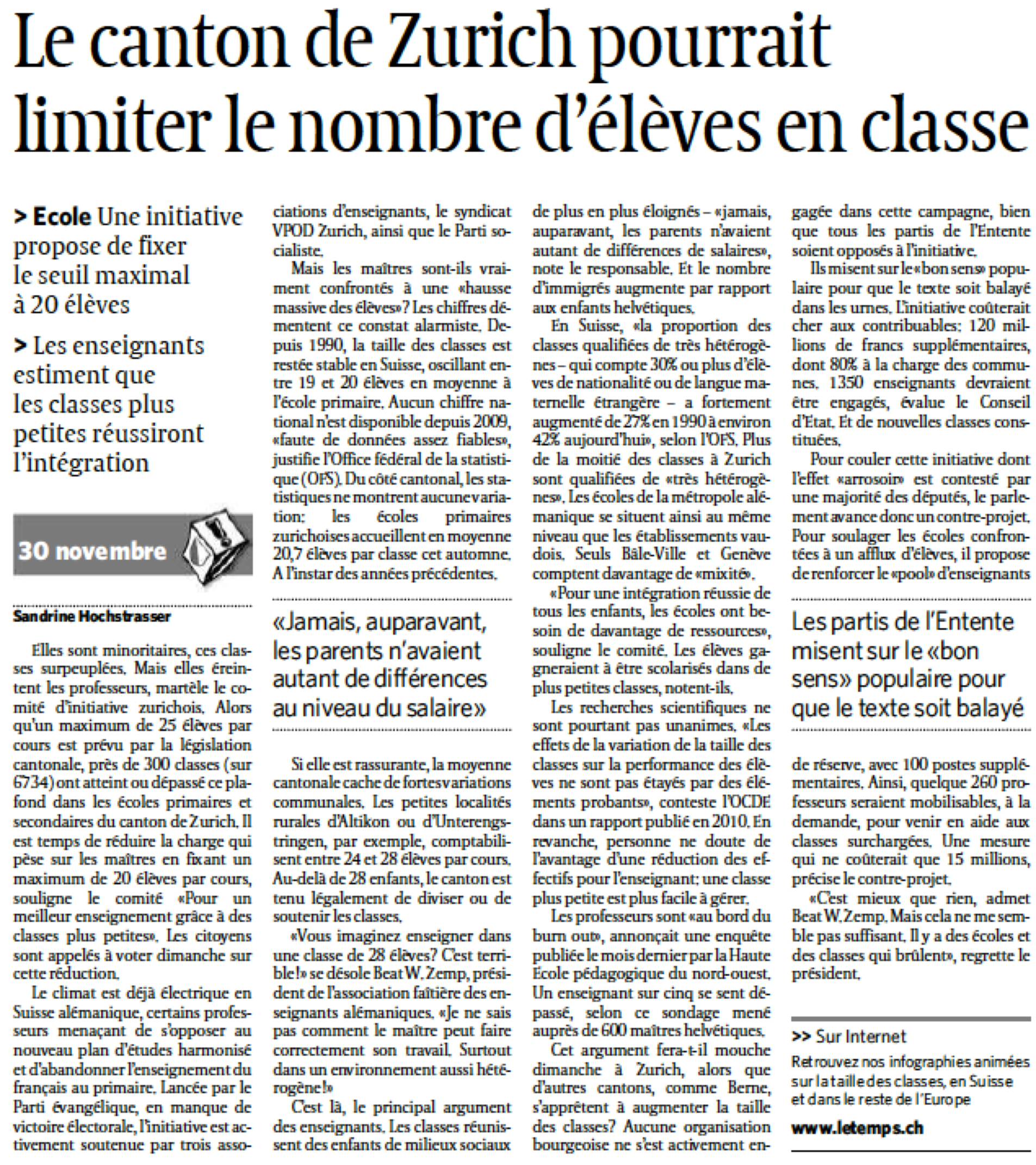 Le 30 novembre les Zurichois se prononceront sur une initiative cantonale pour limiter à 20 le nombre d’élèves en classe. Et si, dans notre canton, on lançait une initiative de ce type ?