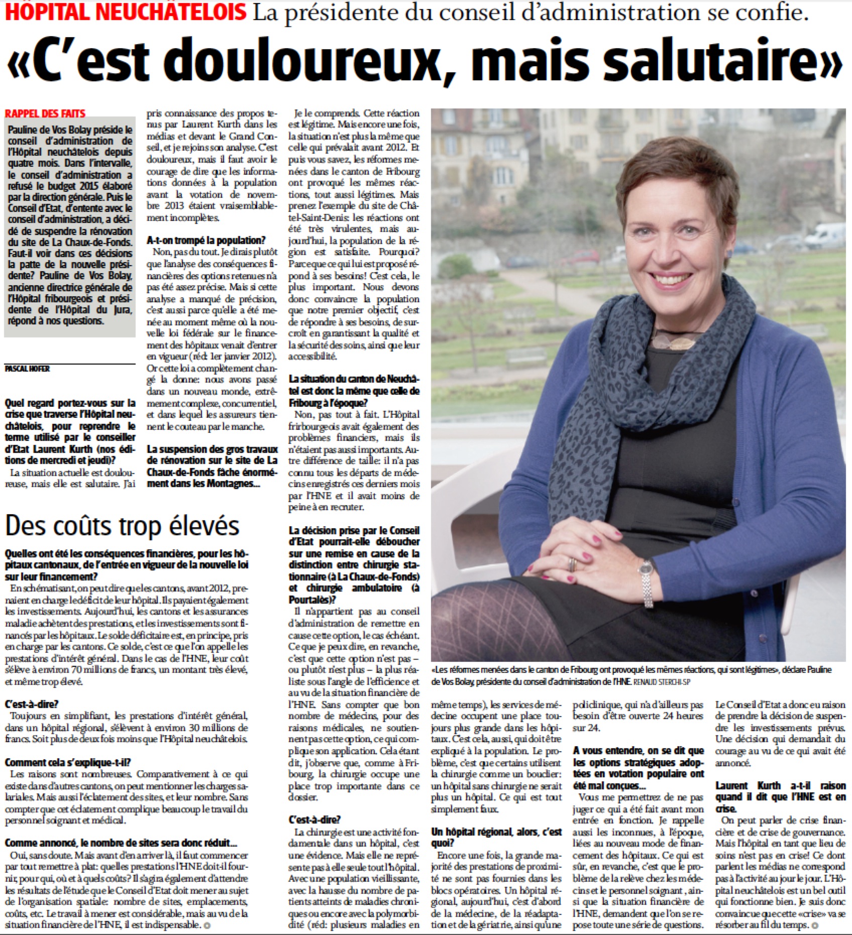 Merci, chère Madame Pauline de Vos Bolay, présidente du conseil d’administration de l’Hôpital neuchâtelois, de vous être si sincèrement « confiée » aux lecteurs de L’Impartial ce samedi de janvier 2015.