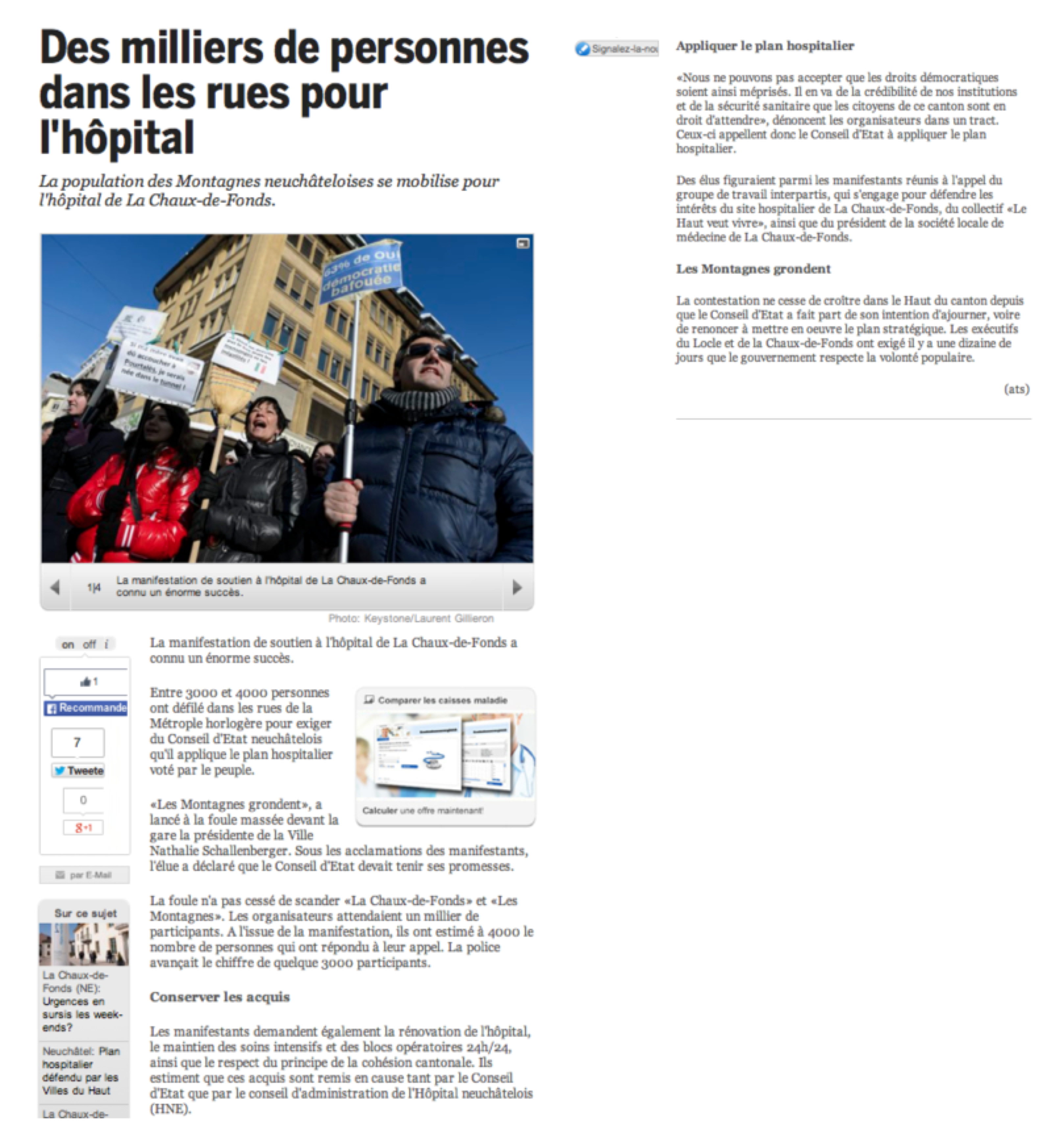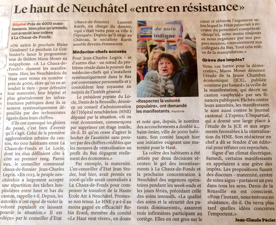 Le 7 février 2015 fera date dans l’histoire politique de la République et Canton de Neuchâtel. C’est la première fois depuis l’instauration de la République contre les Prussiens que les villes Hautes, population et élus unis, disent dans la rue un grand oui au respect de la démocratie, malmenée par le gouvernement de cette République même.