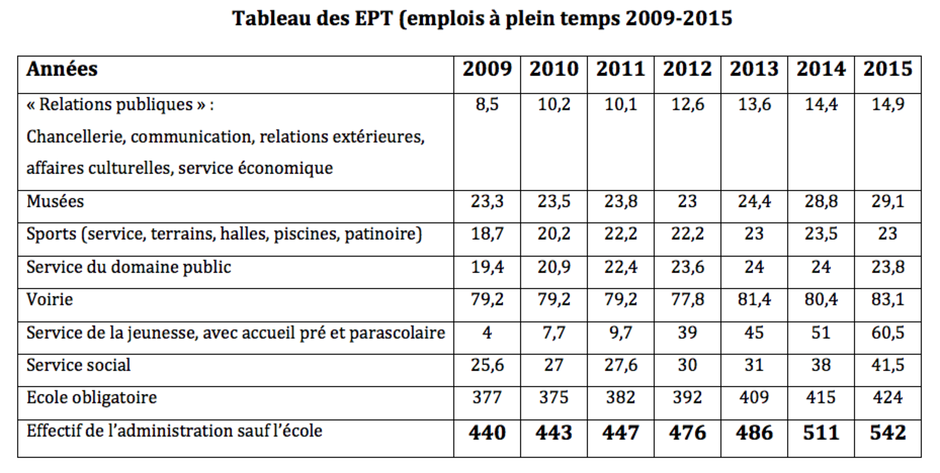 L’examen détaillé ci-dessous montre en outre le net accroissement du personnel communal depuis 2009, mais pas dans tous les services ! Les chiffres du tableau concernent le nombre d’EPT, emplois à plein temps. Nous n’avons choisi que quelques services car le travail de recherche des données est fastidieux !