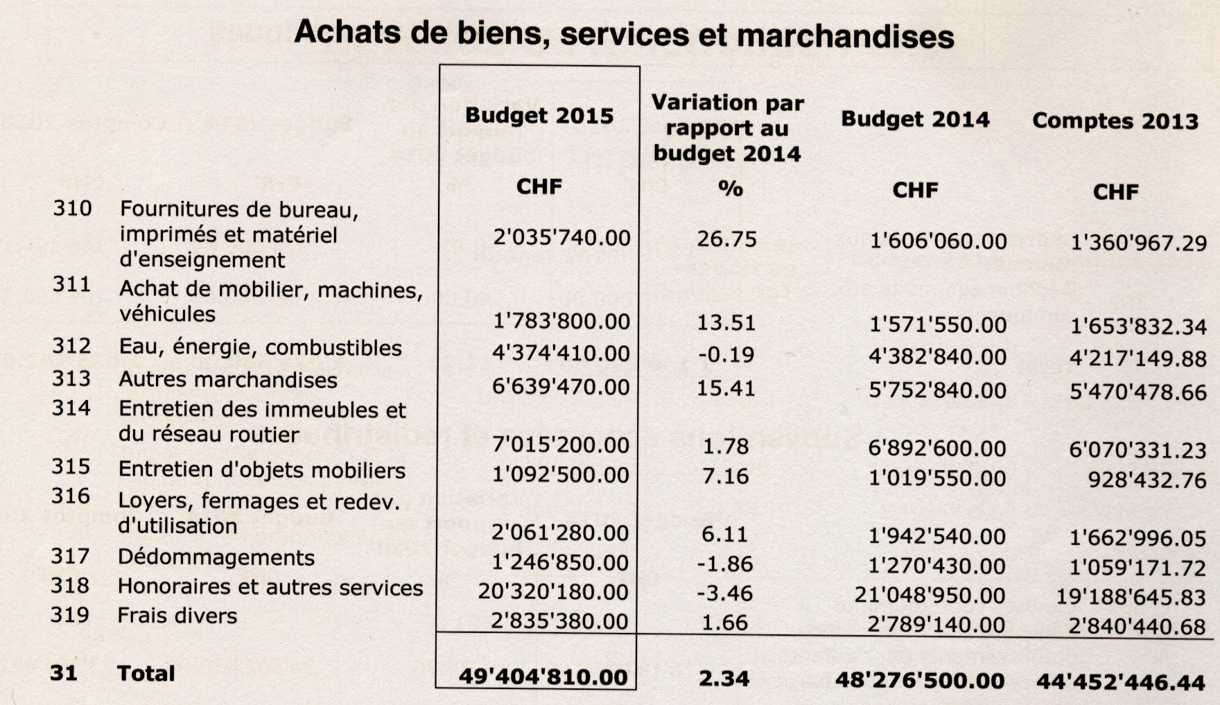Le tableau ci-dessous parle de lui-même : en deux ans (des comptes 2013 au budget 2015), les achats de biens, services et marchandises augmentent de plus de 10 % ! La refonte du budget 2015 devra retrouver des chiffres autour de 45 mio.