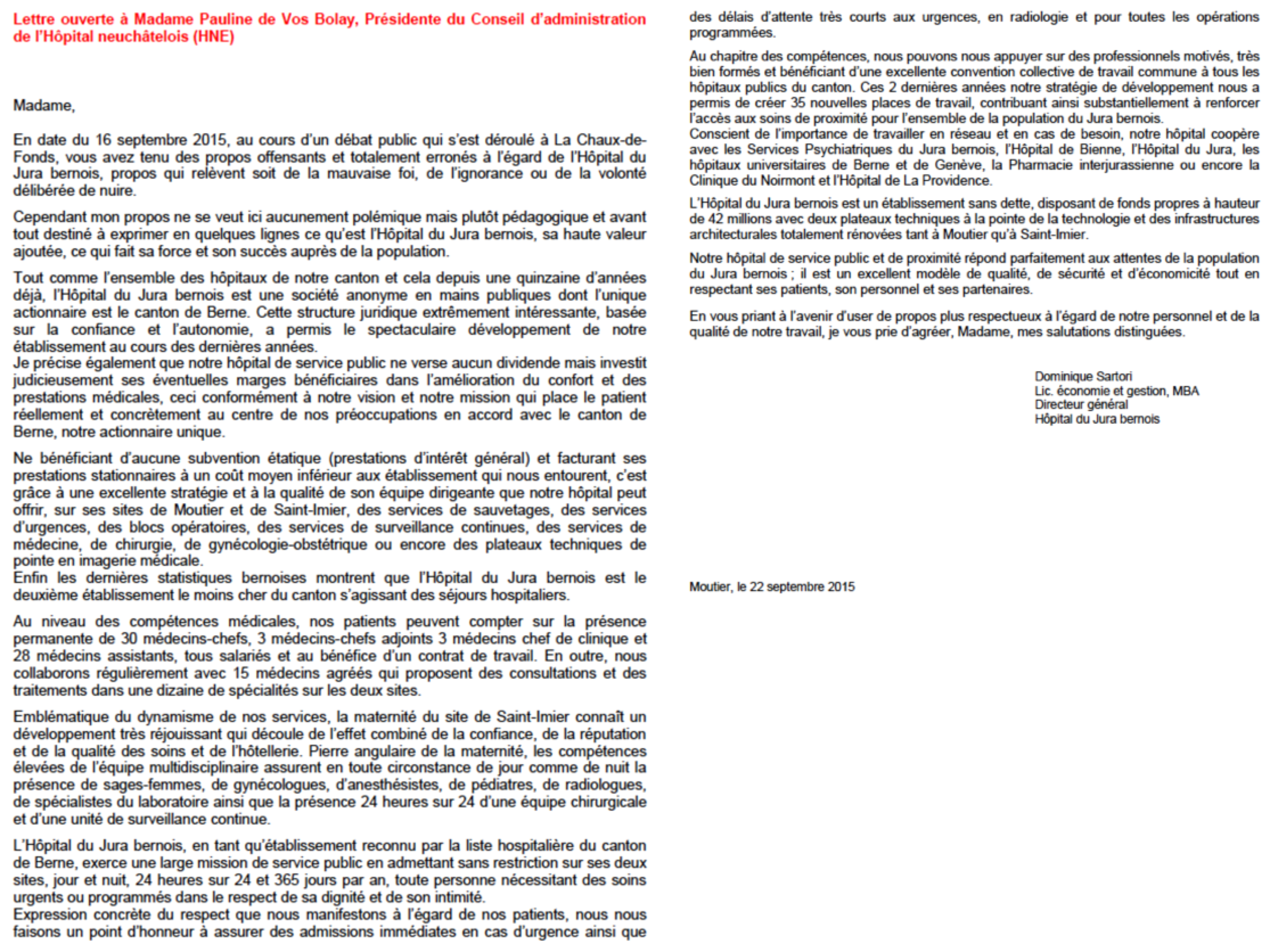 Ce qui a suscité ce commentaire de Antoine Chollet sur mon profil Facebook, avec lequel je suis d’´accord :  » La présidente du CA de HNe peut-elle ignorer qu’elle induit sciemment en erreur en faisant suivre sa phrase sur l’hôpital du Jura bernois par une définition générale de ce qu’est une SA? Et notamment sur le fait qu’il n’y a qu’un seul actionnaire dans le cas d’espèce, et qu’il s’agit de l’État de Berne, ce qui change beaucoup de choses? Précisons en outre que l’hôpital du Jura bernois est signataire de la CCT du personnel des hôpitaux bernois, et qu’il ne se trouve pas dans un désert conventionnel, comme, là aussi, la présidente du CA le laisse perfidement sous-entendre (même si elle ne le dit pas, mais parfois l’omission vaut mensonge, ou du moins manipulation). »