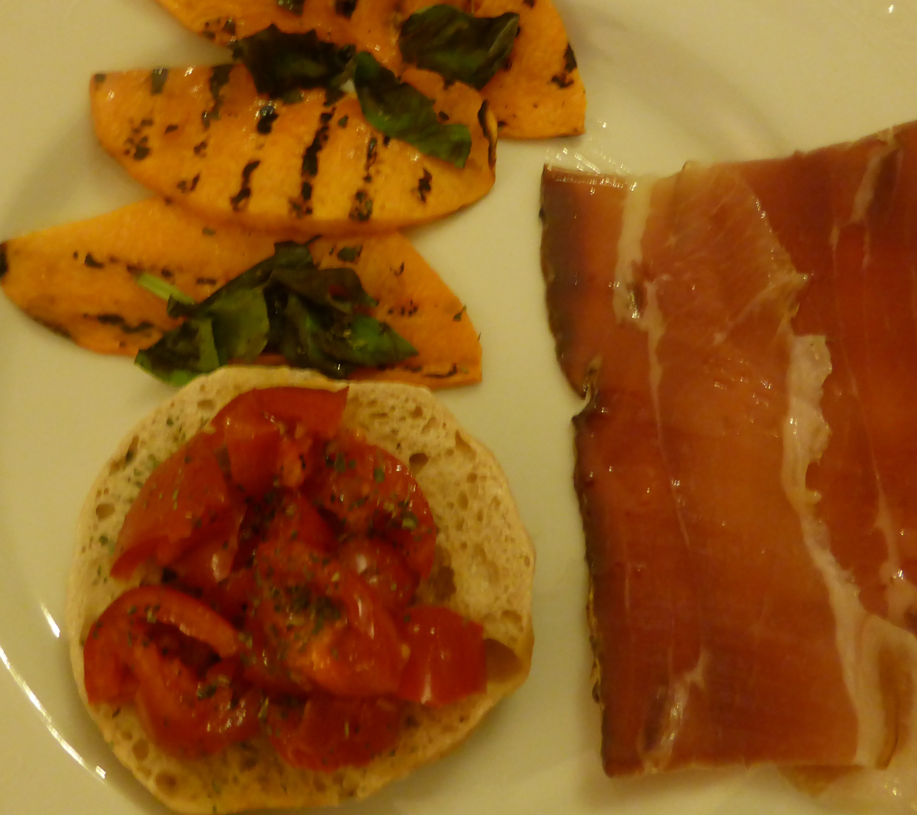 Comme très léger et goûteux « secondo piatto », quelques tranches de rôti de porc « alla genovese », c’est-à-dire mijoté avec des oignons et des carottes. En accompagnement, des tranches de tomates sorrentines (une variété locale d’un rouge pâle) au basilic, condimentées avec de l’huile d’olive citronnée.