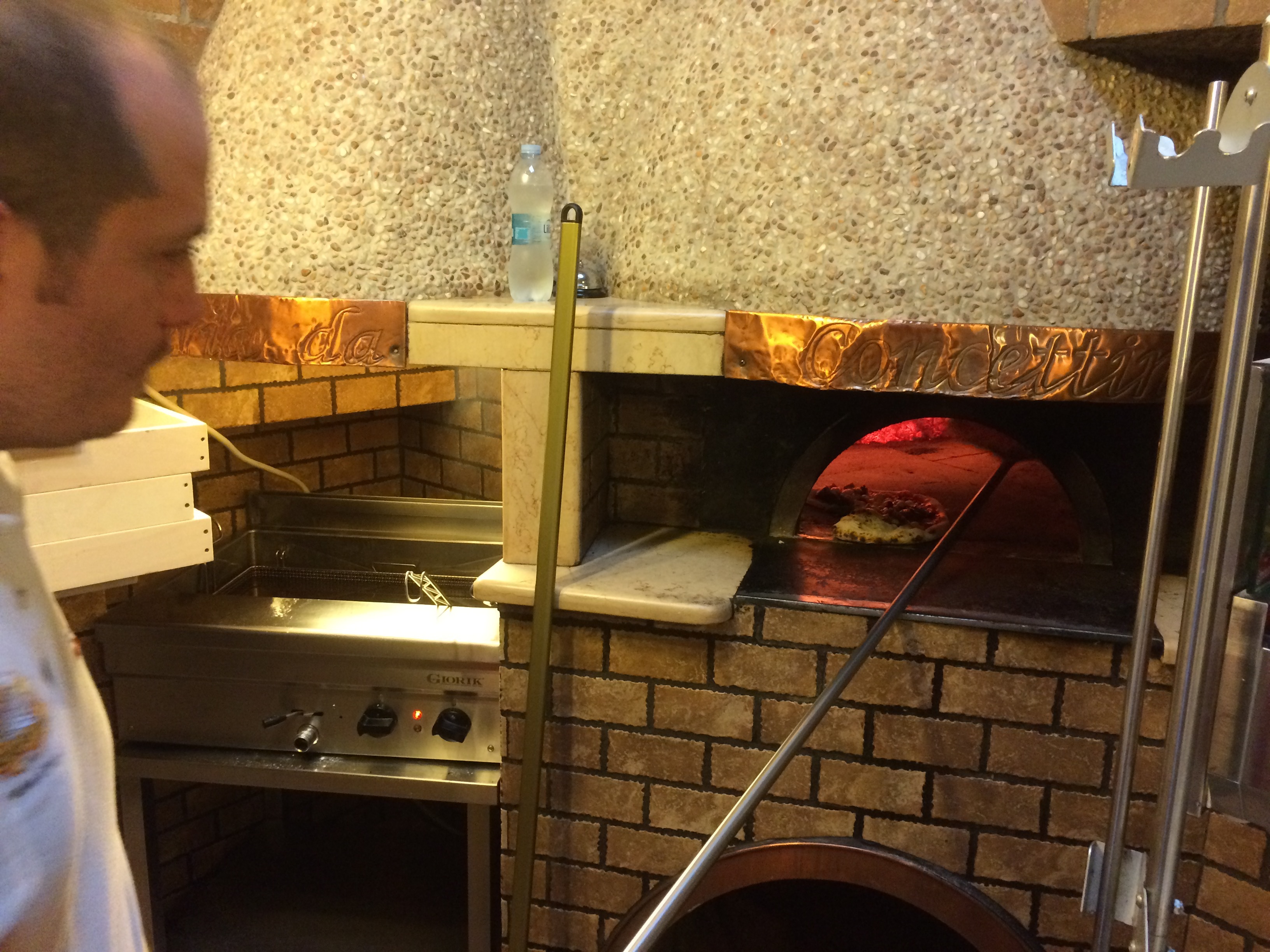 Une partie du commerce est consacré à la vente à l’emporter : tranche de Margherita à un euro et demi, croquettes de riz aux petits pois (arancino) ou aux pommes de terre à cinquante centimes. La pizza entière à l’emporter coûte trois euros.
