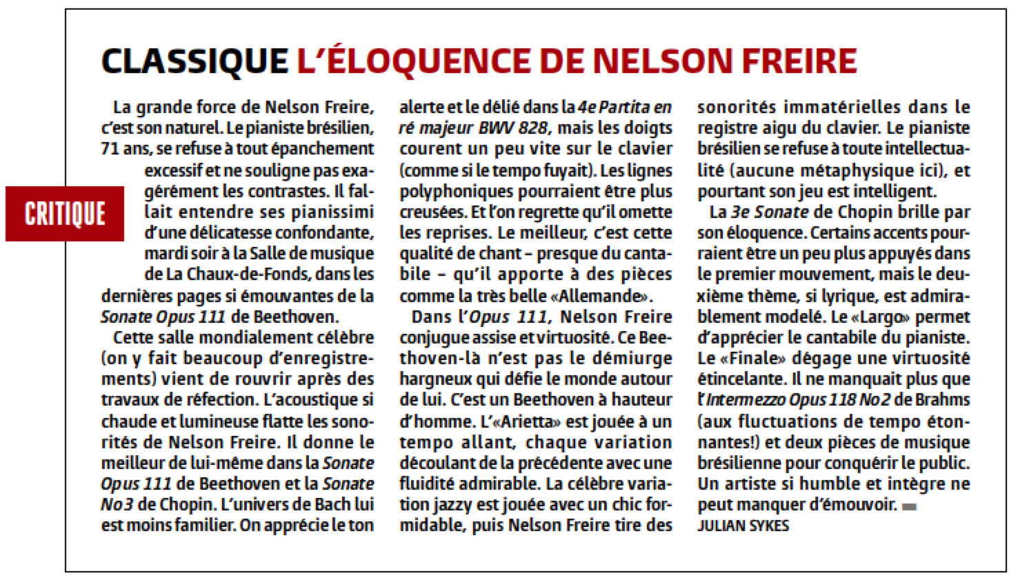 Jamais peut-être un piano n’a chanté si beau, avec de telles couleurs, avec de telles lignes tendues vers des sommets que lors du récital de Nelson Freire dans la Salle de musique rénovée de La Chaux-de-Fonds le 27 octobre 2015.