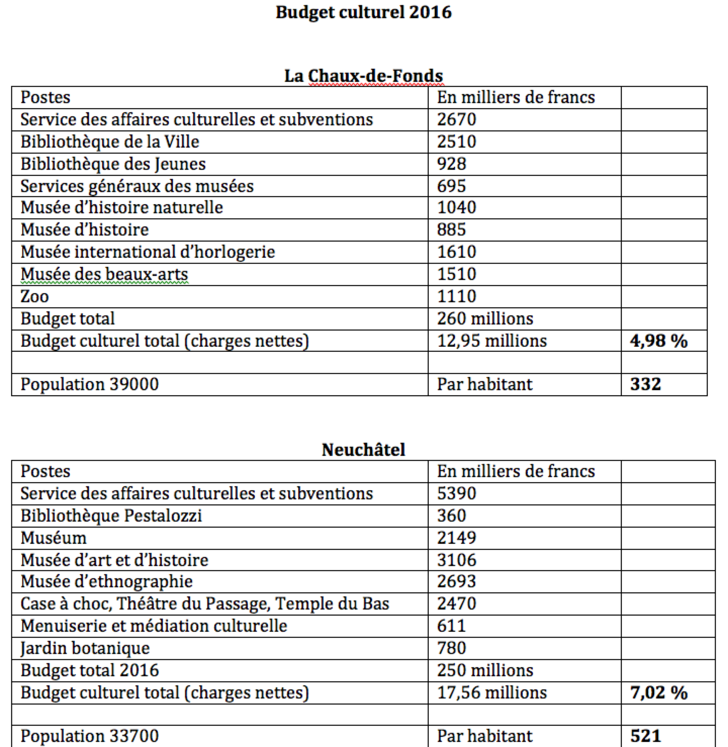 En 2016, la ville de La Chaux-de-Fonds dépensera le 4,98 % de son budget pour la culture soit 332 francs par habitant, ce qui la situe dans la moyenne des villes suisses. En comparaison, Neuchâtel dépensera 7, 02 % et 521 francs par habitant.