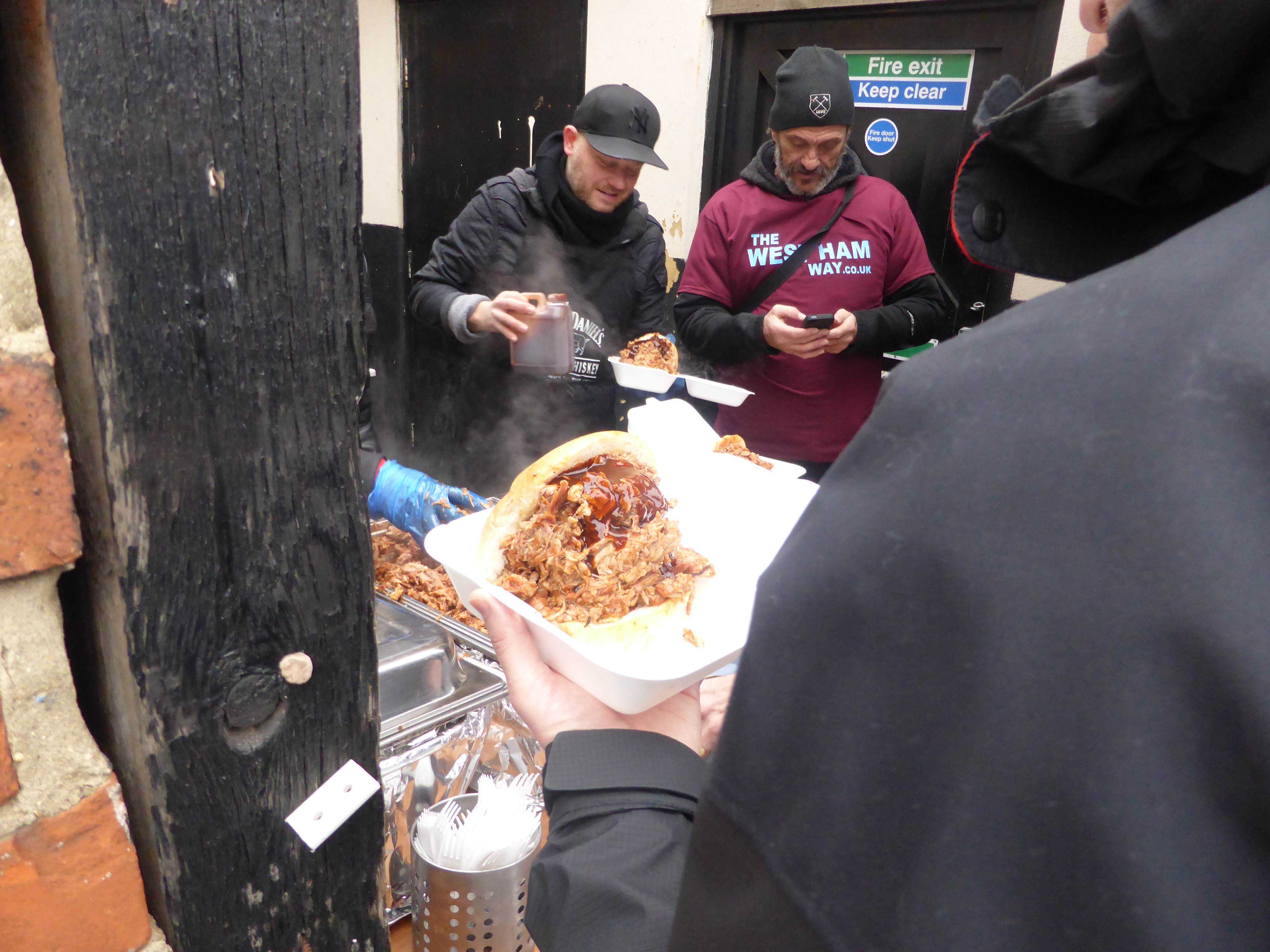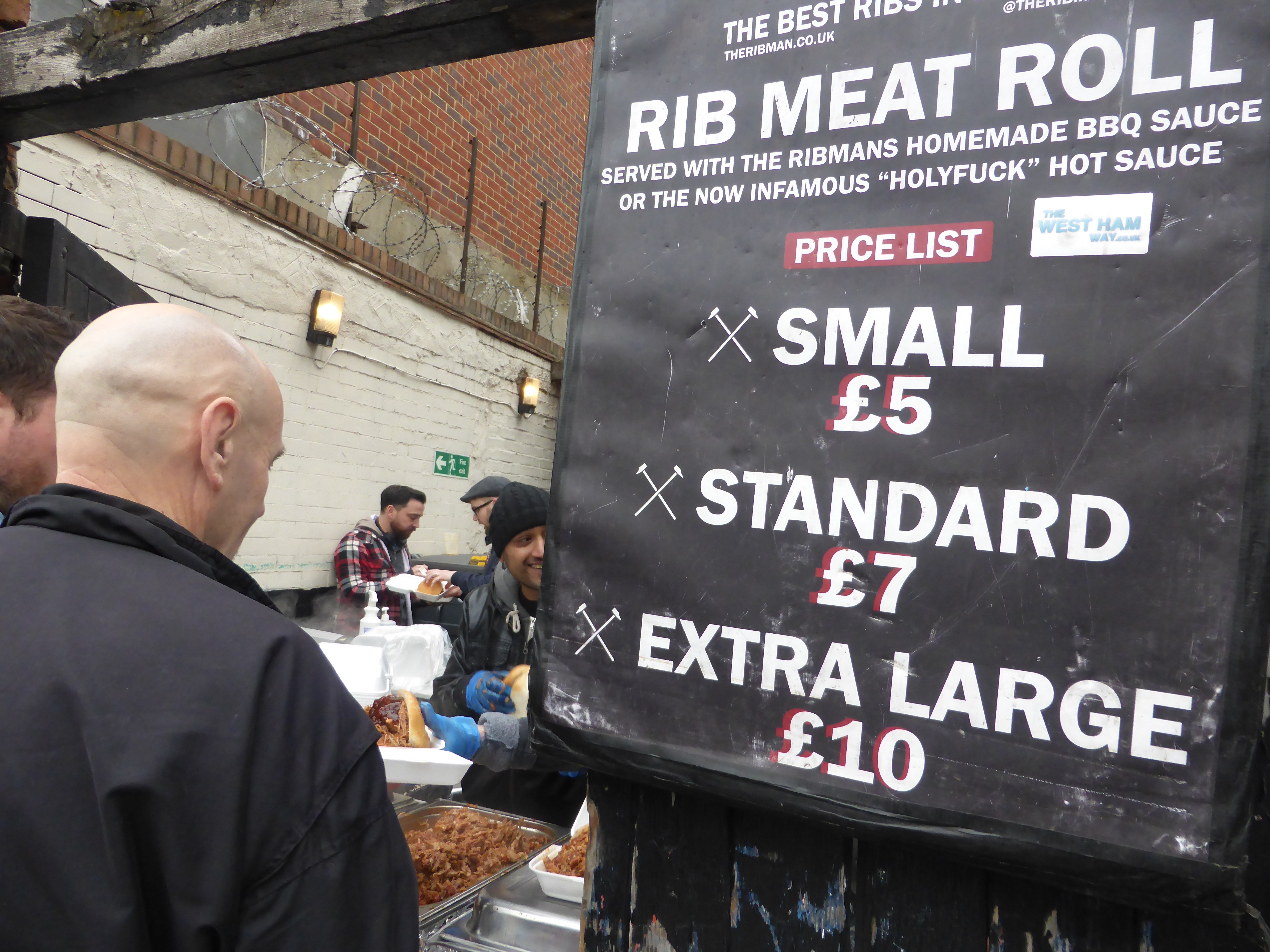 Si l’on veut prendre de l’énergie avant le match, ce jour-là à 12 h 45, on peut s’empiffrer de douteux burgers ou, mieux, d’une sorte de sandwich au boeuf bouilli, le Rib Meat Roll : trois grandeurs à disposition, arrosé d’une sauce brune piquante, la Holyfuck hot sauce.