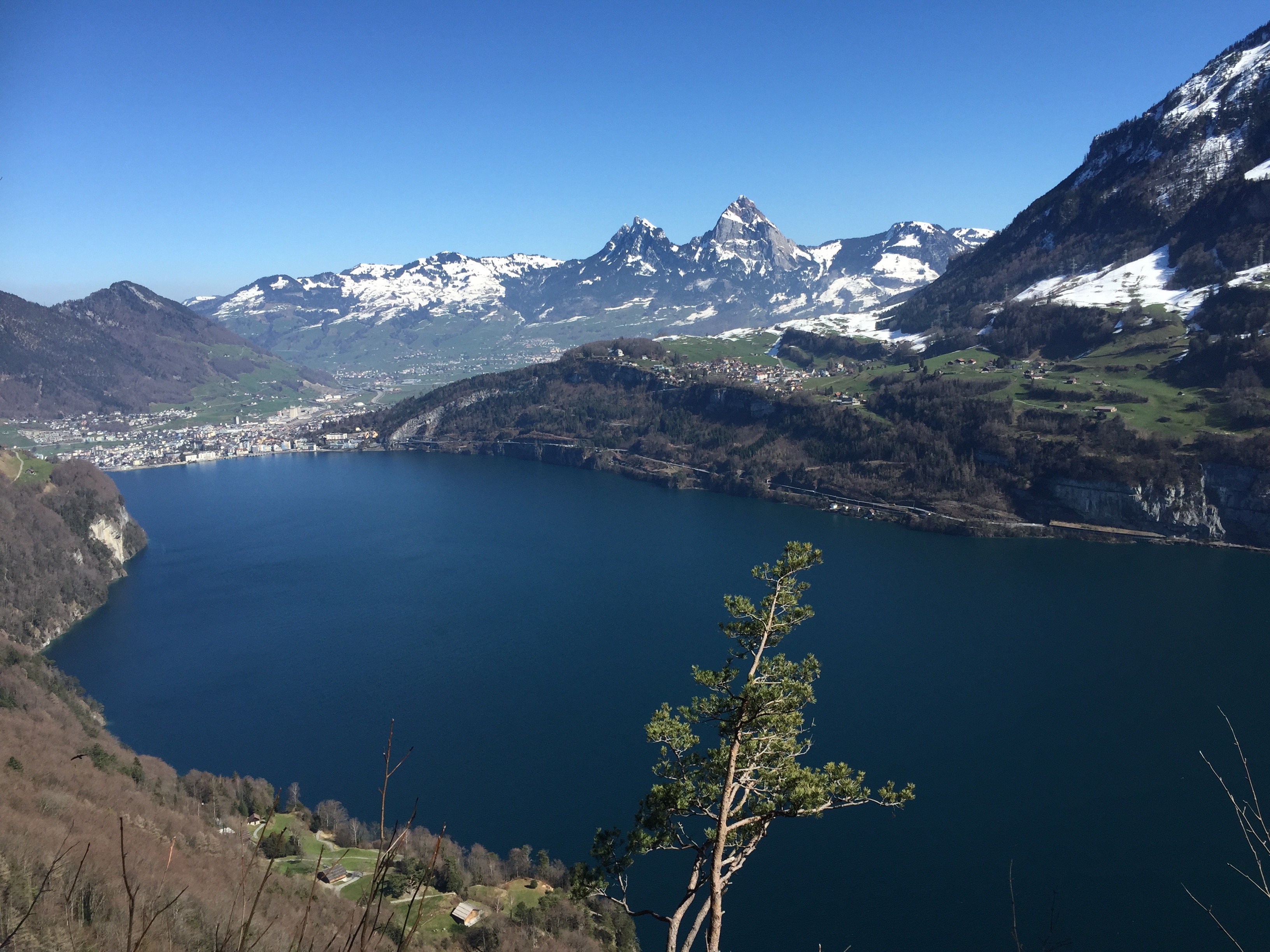 Le chemin de Seelisberg à Bauen passe par ce point de vue qui surplombe le prairie du Grütli devant la partie uranaise du lac des Quatre-Cantons, l’Urnersee. Au fond, la bourgade aisée de Brunnen, dans la partie schwyzoise du lac. La ville de Schwyz est un peu plus haut au pied des deux Mythen glaronnais, le grand et le petit. A droite, le bas de la montagne Stoos et le village de Morschach, au dessus de la ligne ferroviaire vers le Tessin, l’Axenstrasse.