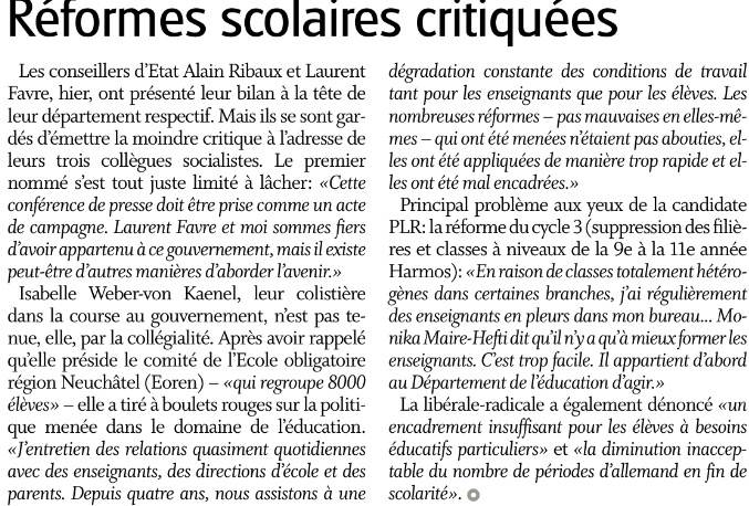 La candidate PLR Isabelle Weber a la prétention d’accéder au Conseil d’Etat et hier, en présence de ses colistiers MM. Favre et Ribaux, elle a porté des attaques frontales contre l’action de l’actuelle cheffe du Département de l’Education, Monika Maire-Hefti. Si les arguments de Madame Weber étaient solides, on pourrait alors ne pas l’accuser d’avoir du toupet. Or, cette candidate, complètement inconnue dans les Montagnes, veut faire le buzz avec du vent. Les électeurs de gauche, notamment les enseignants, qui voudraient donner une leçon dans les urnes à Mme Maire-Hefti seraient bien inspirés d’écouter très attentivement ce que Madame Weber dit de son programme financier pour l’école.
