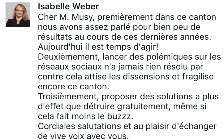 J’avais début mars fait une analyse des enjeux de la future élection au gouvernement et parlé de Madame Weber en ces termes libres:  « Le PLR ne part qu’avec trois candidats (les sortants Favre et Ribaux et la nouvelle, Isabelle Weber, totalement inconnue et d’ailleurs sans réaction aucune sur les réseaux sociaux [après la votation sur les hôpitaux]. Cette candidate (a-t-elle quelque chose à dire après le 12 février ?) est trop peu profilée pour faire jeu égal avec Favre et Ribaux et le PLR a avantage à tenir les rênes du Grand Conseil plutôt que de mettre les mains dans le cambouis avec une majorité au Conseil d’Etat.