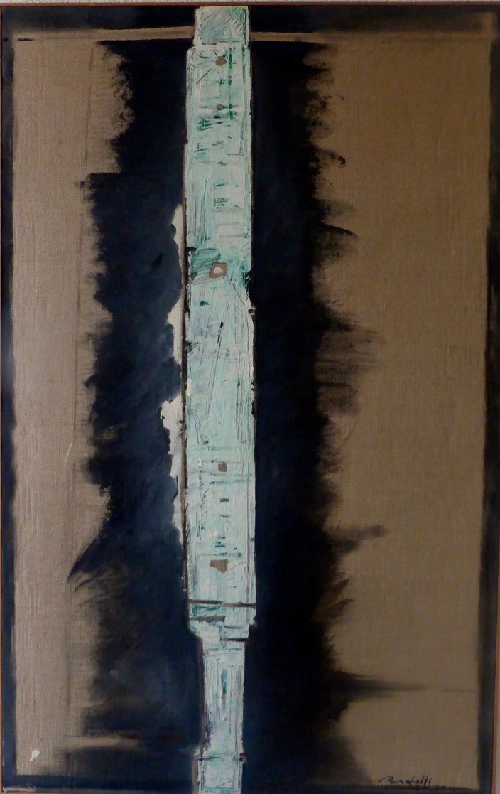 Rien de plus parlant pour ce bref hommage, si nécessaire en ces jours de séparation, que la peinture que j’ai chez moi depuis si longtemps. Sans titre, c’est un totem qui s’érige sur un halo noir étalé sur la toile à la trame largement apparente.