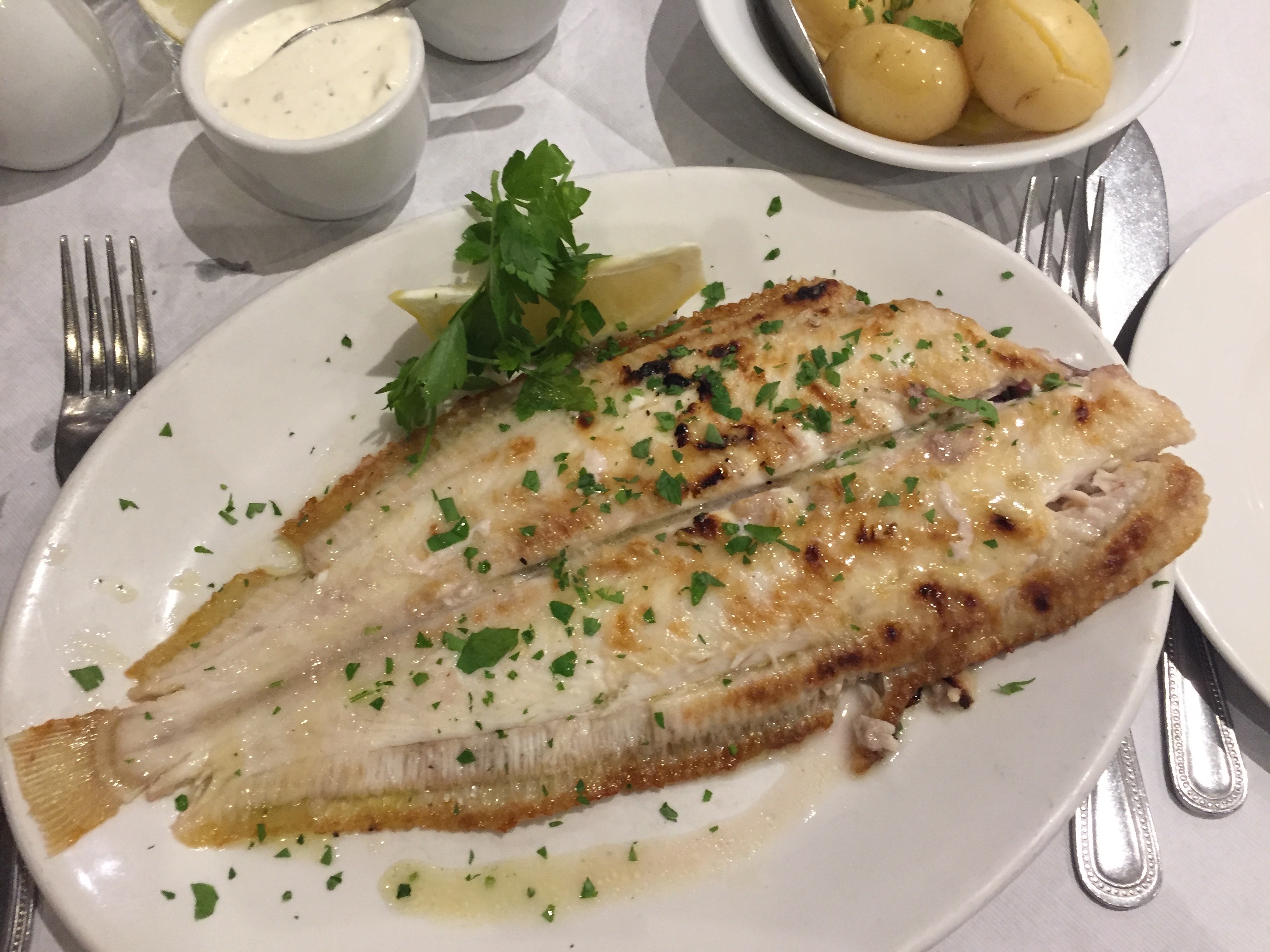L’intérêt majeur du restaurant est de proposer aussi ces poissons grillés, pouvant même, être servis avec des pommes de terre en robe des champs et de la traditionnelle mashy peas, la purée de petits pois.On frôle alors le grandiose avec la partie centrale de la raie (medium skate),