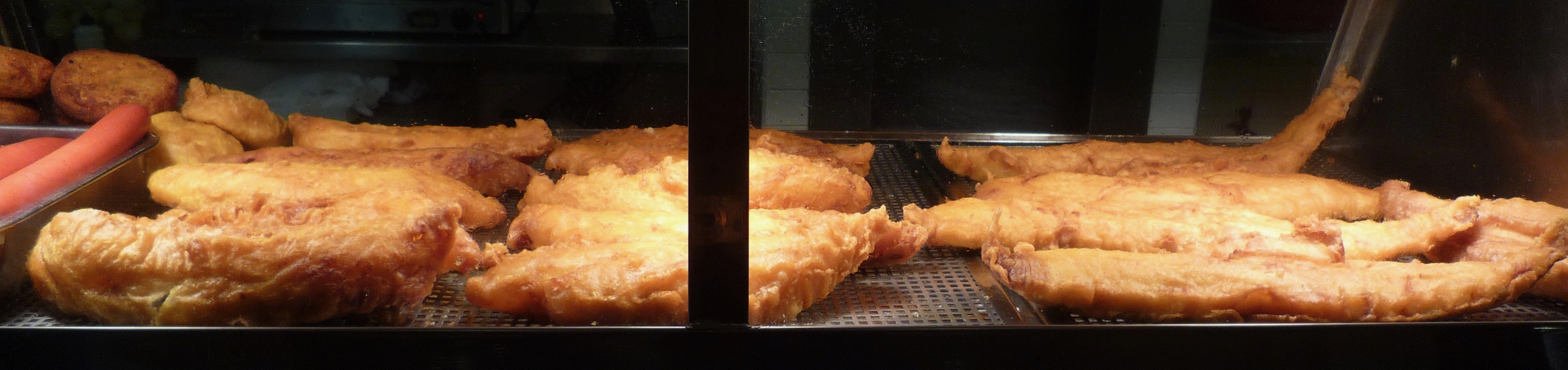 The fish is fried and coated in batter, which is incomparably crispy, even at the end of the meal. Local customers buy it to take away with chips, and the restaurant serves it with tartar sauce and ketchup.