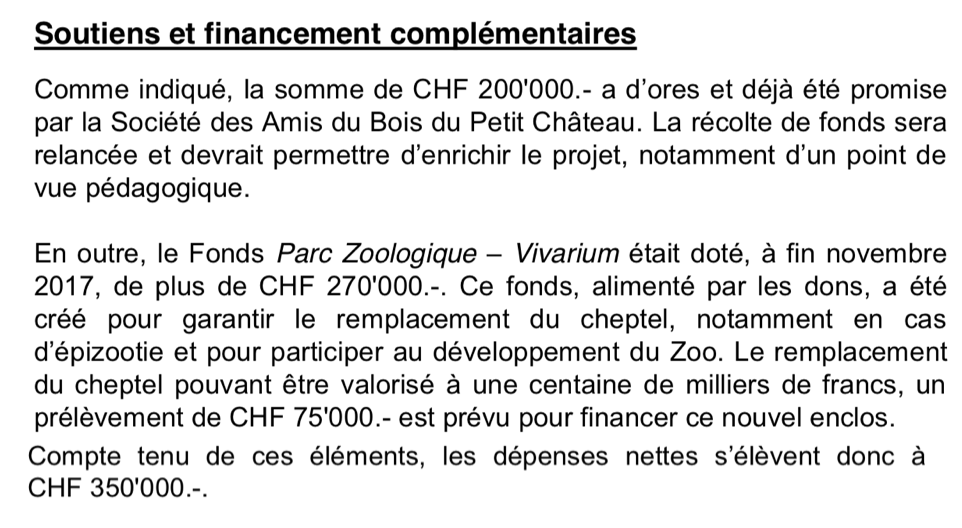 B) Le sens d’un petit zoo du XXIe siècle : Un zoo du XXIe, modeste ou immense, n’a de sens que s’il sensibilise le public aux menaces qui pèsent sur nombre d’espèces animales. Passé le temps où on exposait des bêtes en cages. Il doit offrir aux animaux menacés des espaces correspondant à des critères de bien-être et, surtout, attractifs pour le public. Le zoo de Zürich a dépensé 57 millions pour les six bassins du nouveau parc pour éléphants et 650’000 francs pour nos loutres – au total – reste un investissement modeste. Surtout que ce même mardi 6 février le Conseil général a accepté un crédit de 28 millions de francs sur quatre ans pour la réfection de routes et de canalisations !