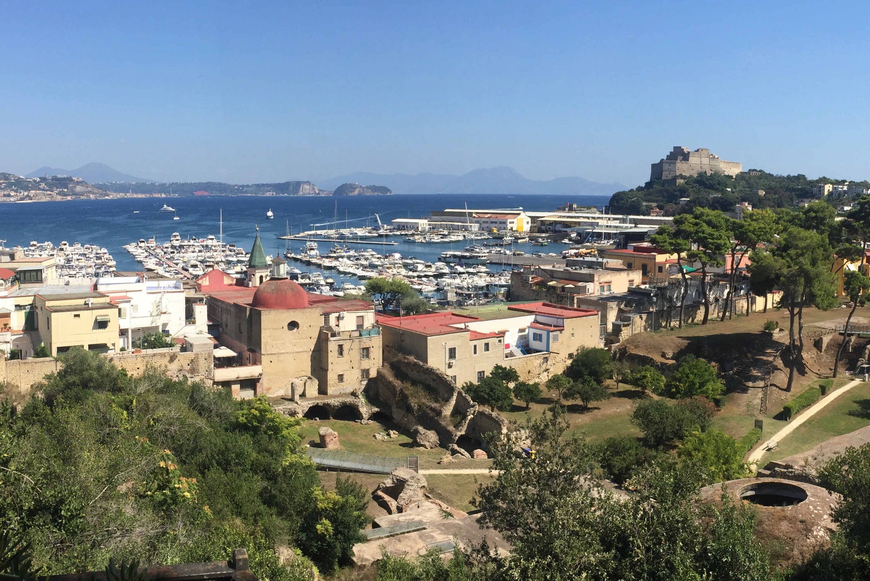 Et c’est vrai, même aujourd’hui où le site se présente accolé contre une colline donnant sur le nord-est. Les ruines des grandes villas patriciennes et de leurs thermes descendent vers la mer; le port moderne fait face au Vésuve à gauche, à la ville de Pouzzoles et au cap Pausilippe au milieu de l’image; au fond, la péninsule sorrentine est coupée par le château moyenâgeux de Baia. Au bas de l’image à droite, la fameuse coupole d’un frigidarium. Lieu ensoleillé le matin et à l’ombre dès le mileu de l’après-midi en été. Lieu qui, plus que Pompei, nous fait imaginer sans peine les plaisirs d’il y a plus de deux mille ans.