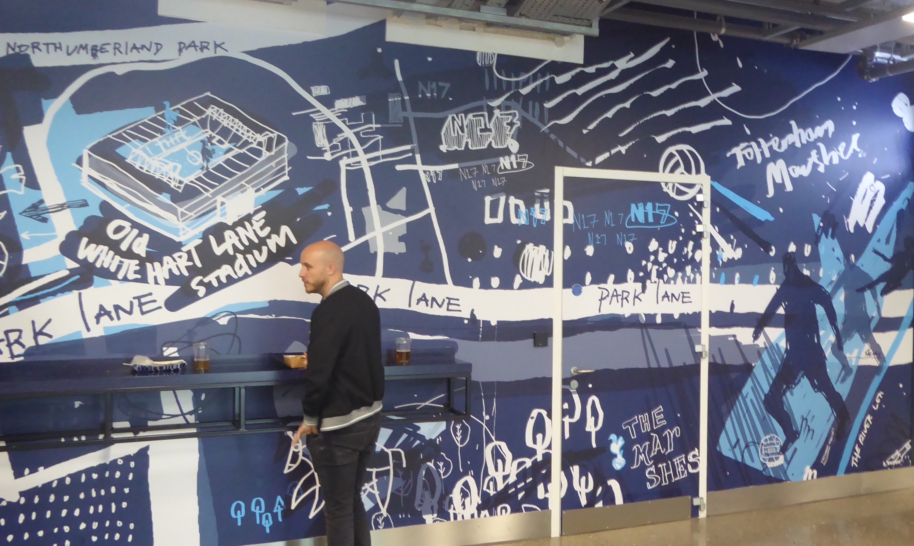 Urbanistiquement, le stade offre à l’amateur d’architecture et de football que je suis une expérience unique depuis 2016 : l’avoir vu se bâtir au fils de mes séjours dans le borough de Haringey où je loge dans une exquise guesthouse à Mountview Road. Jusqu’en mai 2017, l’ancien stade du club, White Hart Lane, était encore en service alors que le chantier commençait. Dès la fin de la saison 2017, le vieux stade a été démoli pour reconstruire la moitié du nouveau sur ses ruines. Les images suivantes, présentes dans les couloirs du nouveu stade, illustrent la métamorphose.