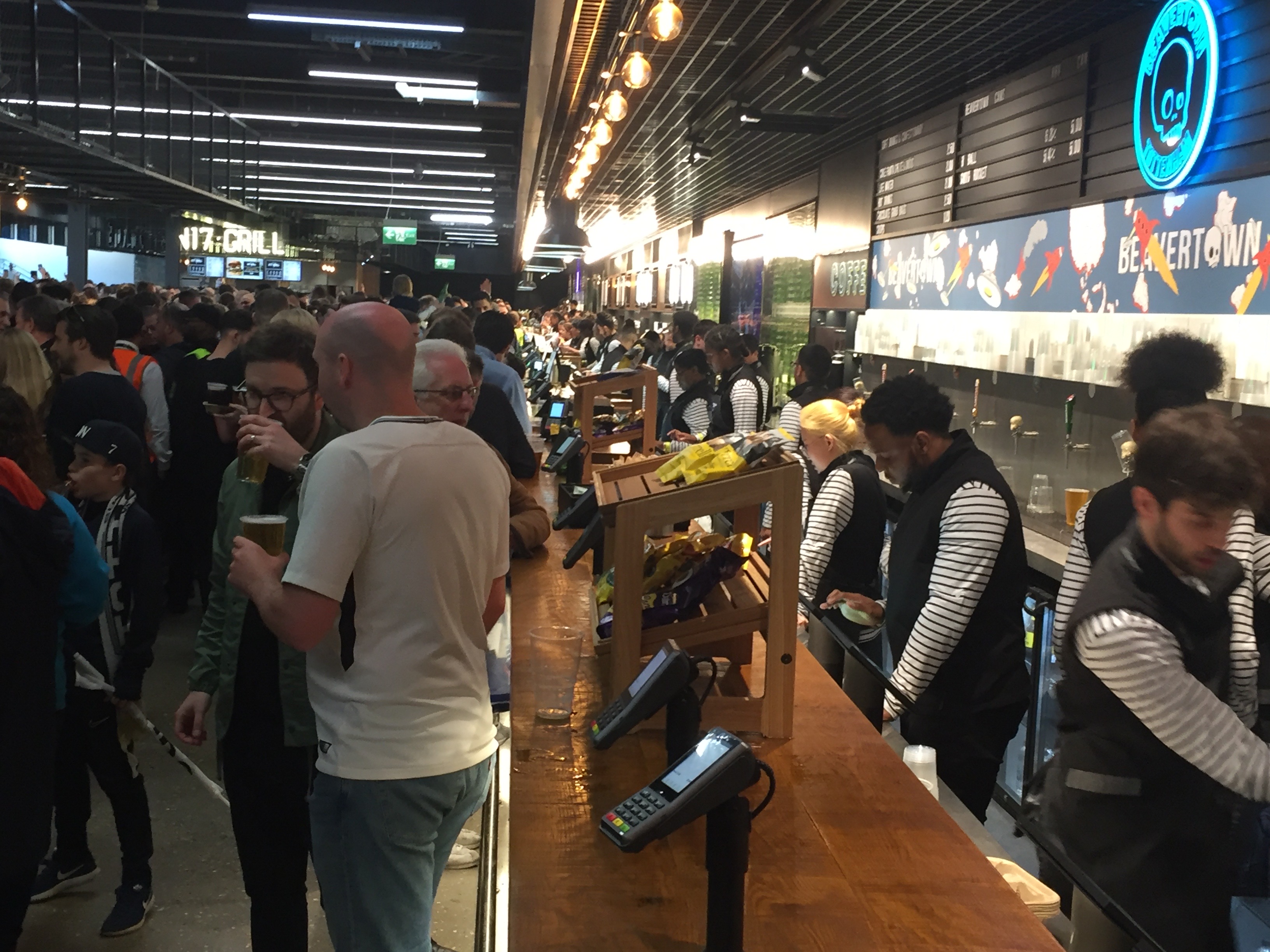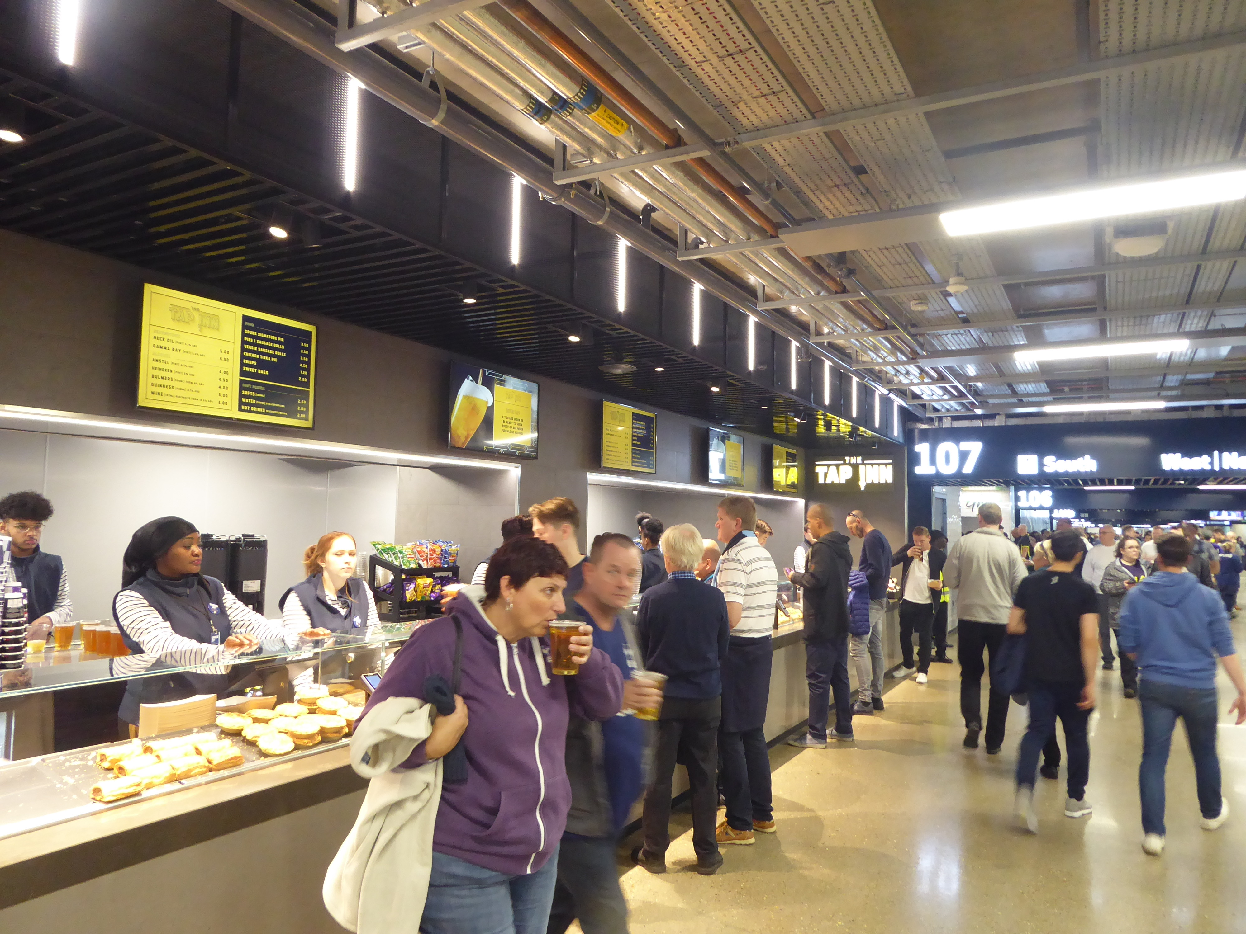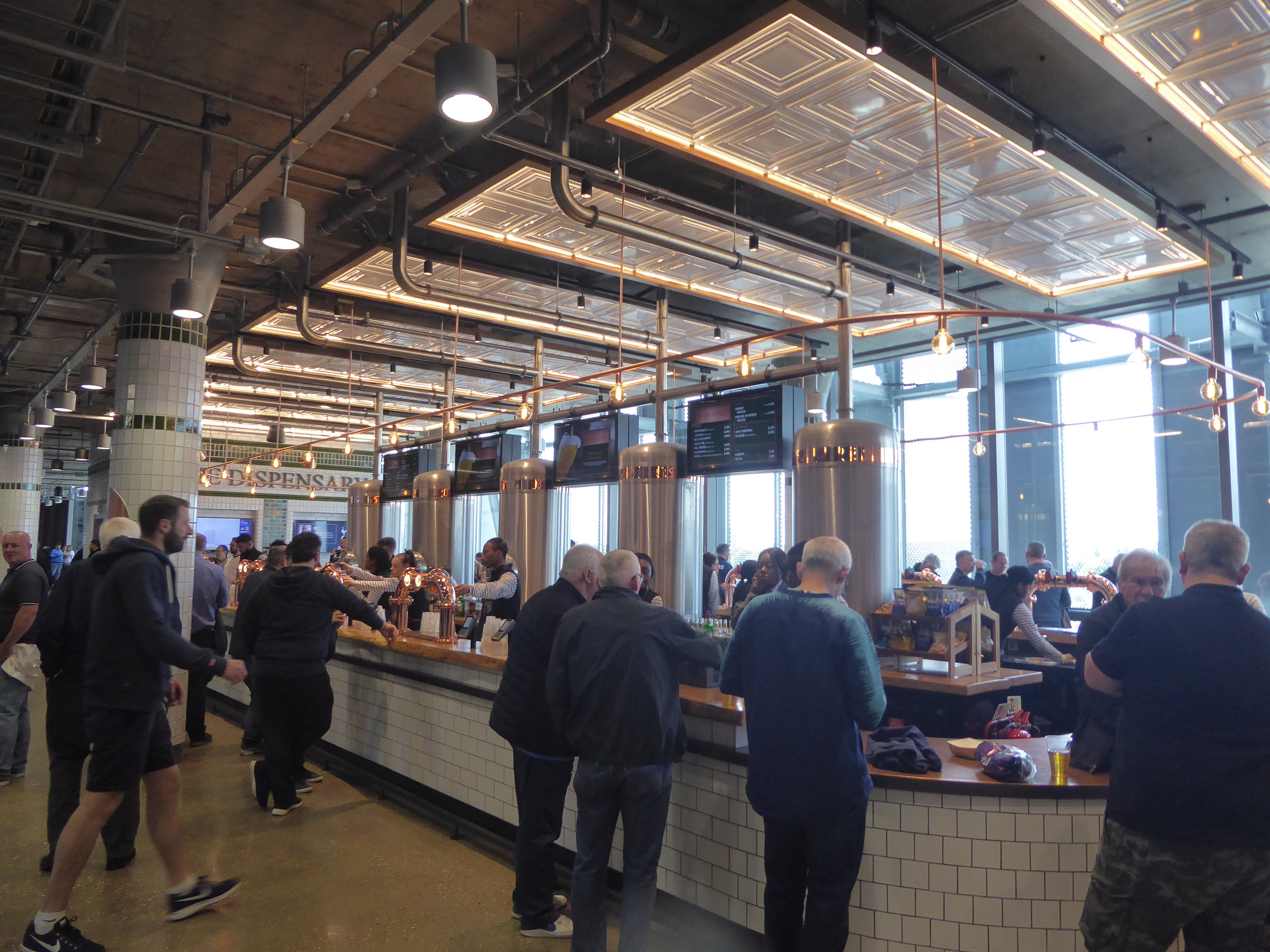 Le plus grand de ces bars, le Goal Line Bar, côté sud, mesure soixante mètres, la largeur d’un terrain de football.