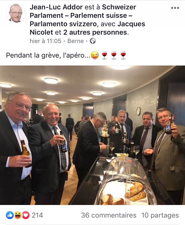 Le 14 juin 2019 des centaines de milliers de femmes suisses ont fait grève pour dénoncer haut et fort les inégalités qui les frappent. A Berne, pendant qu’elles manifestaient vers 11 heures, six parlementaires de l’UDC (extrême–droite) ont été pris en photo par un septième qui a partagé ce cliché sur Facebook. Le décryptage de cette image révèle une misogynie rampante typique de gros lourds d’extrême-droite, style Trump, Salvini, Abascal ou Stache.