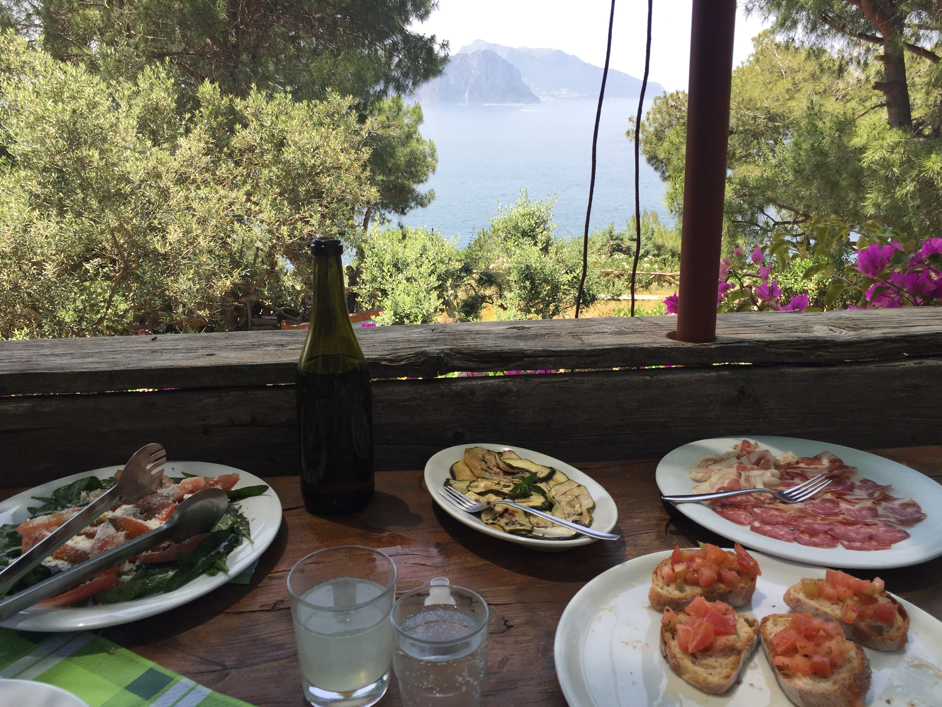 La table en bois devant Capri nous a accueillis avec une carafe d’eau citronnée. La bouteille de vin de table à 11 degrés et l’eau minérale, comme les liqueurs finales, sont compris dans le prix. 20 euros pour ce paysage qui s’est immergé en nous par les yeux, les oreilles entendant les oiseaux chanter, les saveurs et les odeurs des produits.