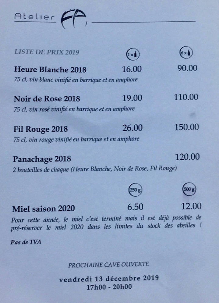 Ce sont des vins poétiques de nom et purs de goût, de culture biologique et presque sans sulfites. Ils valent leur prix, loin des produits normés : un chasselas tranquille sans gaz carbonique, comme du jus alcoolisé d’un bon raisin mûr, l’Heure blanche; un œil-de-perdrix sur le fil du rasoir avec la pureté de ses arômes de bonbons anglais sur un fond fumé, Noir de Rose. Et un pinot gorgé de fruits rouges mûrs tirant sur la cerise capiteuse, un peu trouble car il n’est pas filtré, Fil Rouge. Trois bouteilles de vin d’artiste, loin des circuits habituels : bio et locaux, proches du cœur et de l’intimité qu’on recherche chez un ami.