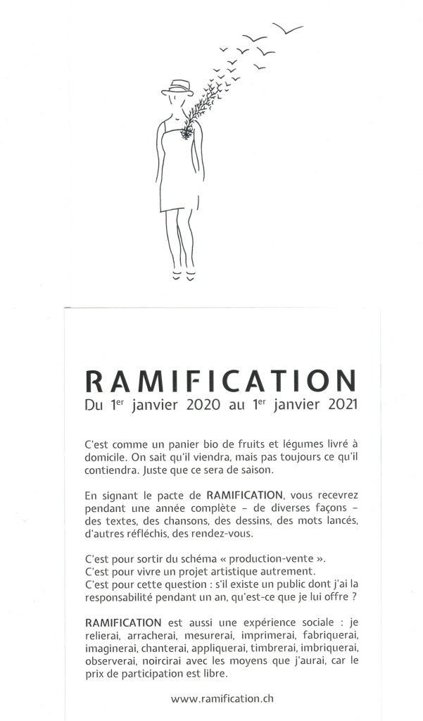 Simon n’en est pas à la première aventure qu’il propose à son public ami. Comme David, il veut créer avec lui une intimité particulière, qu’il avait récemment aménagée dans son tour de chant chez des particuliers de vingt-six cantons suisses. Durant toute l’année 2020, il propose, avec Ramification des dégustations artisanales « de textes, de chansons, des images, des rendez-vous ». Loin des sentiers battus des compagnies subventionnées et des écrivains reconnus. « À la joie de vivifier 2020 », écrit-il.