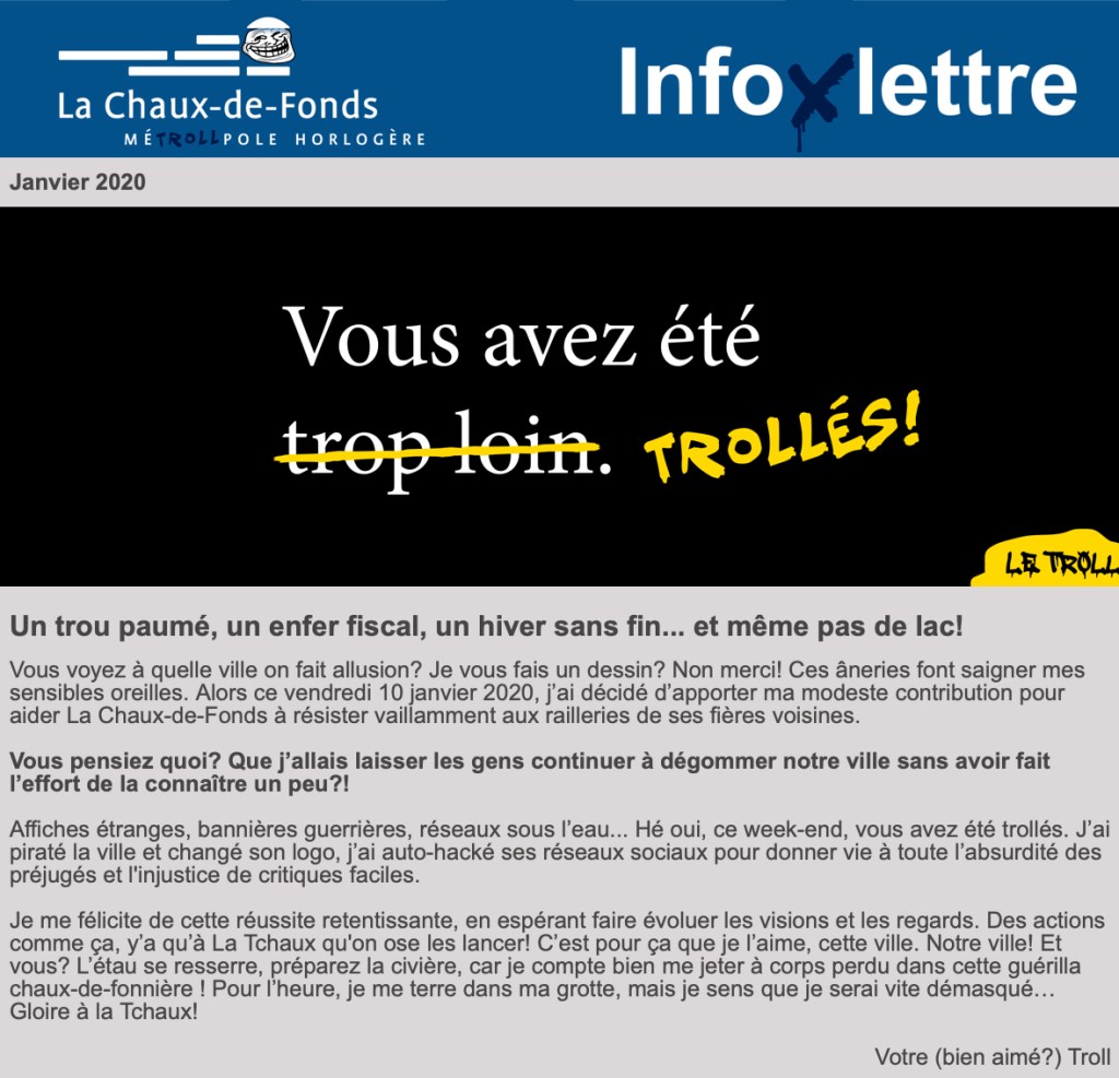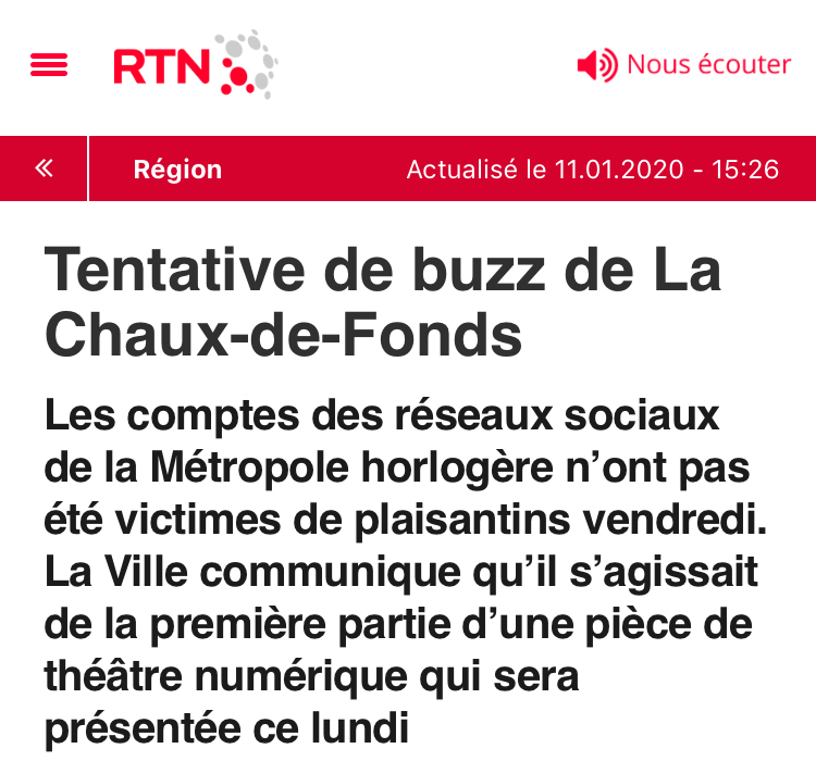 Nous en saurons plus ces prochains jours. Citons aussi le site Arcinfo de ce jour : « Samedi, dans un communiqué qui semble vrai cette fois (le responsable de la communication nous l’a assuré), la Ville de La Chaux-de-Fonds confirme qu’il s’agit bien d’une opération de communication. Elle l’a qualifie de «premier acte d’une pièce de théâtre numérique culottée, commanditée par la Ville de La Chaux-de-Fonds». «Afin d’exposer le déploiement qui se poursuivra par d’autres actions ce lundi matin, avec entre autres la diffusion d’un mockumentary (parodie de documentaire), le Conseil communal convie les représentants des médias à un point-presse lundi 13 janvier 2020 à 9h45« .