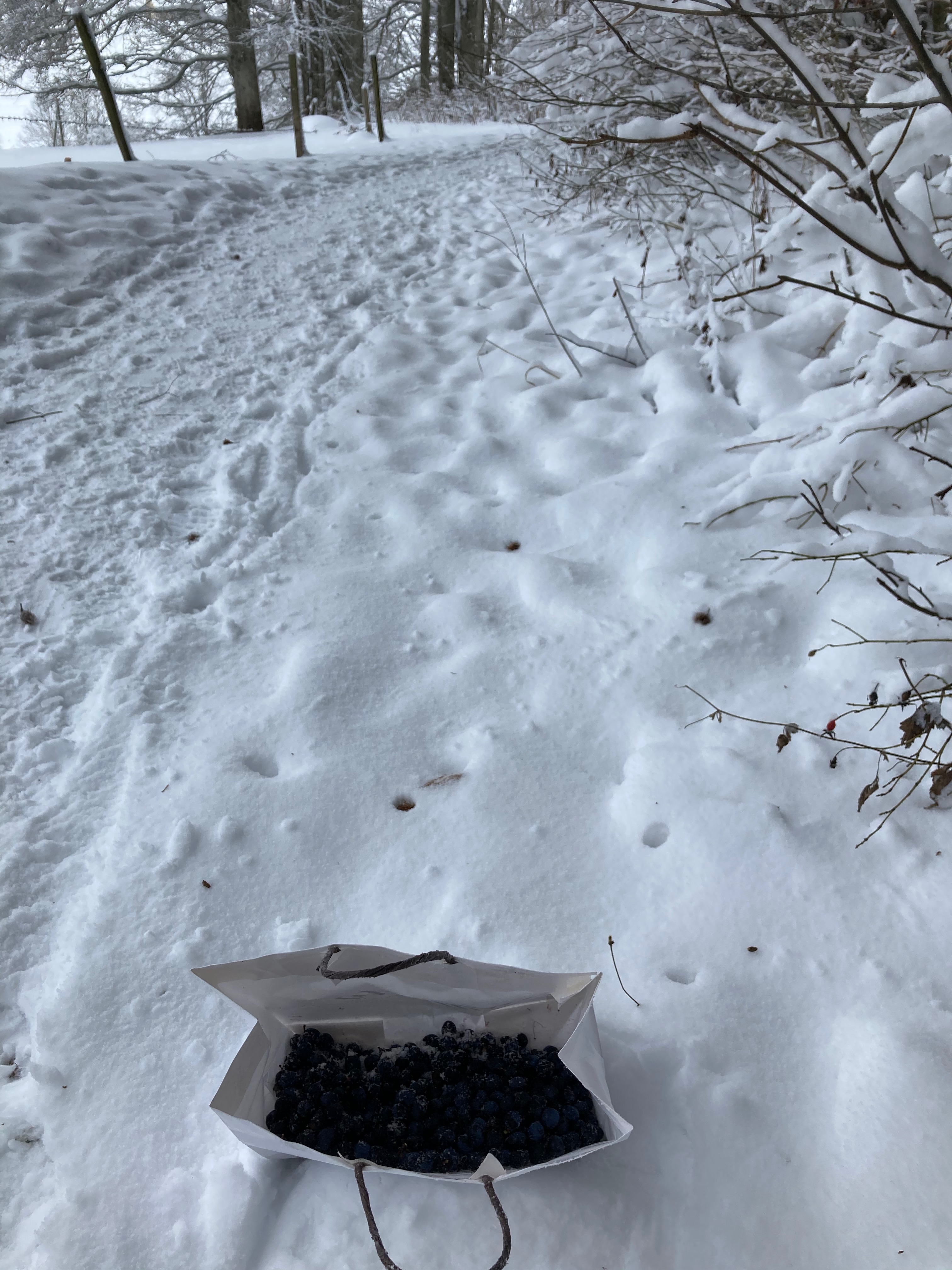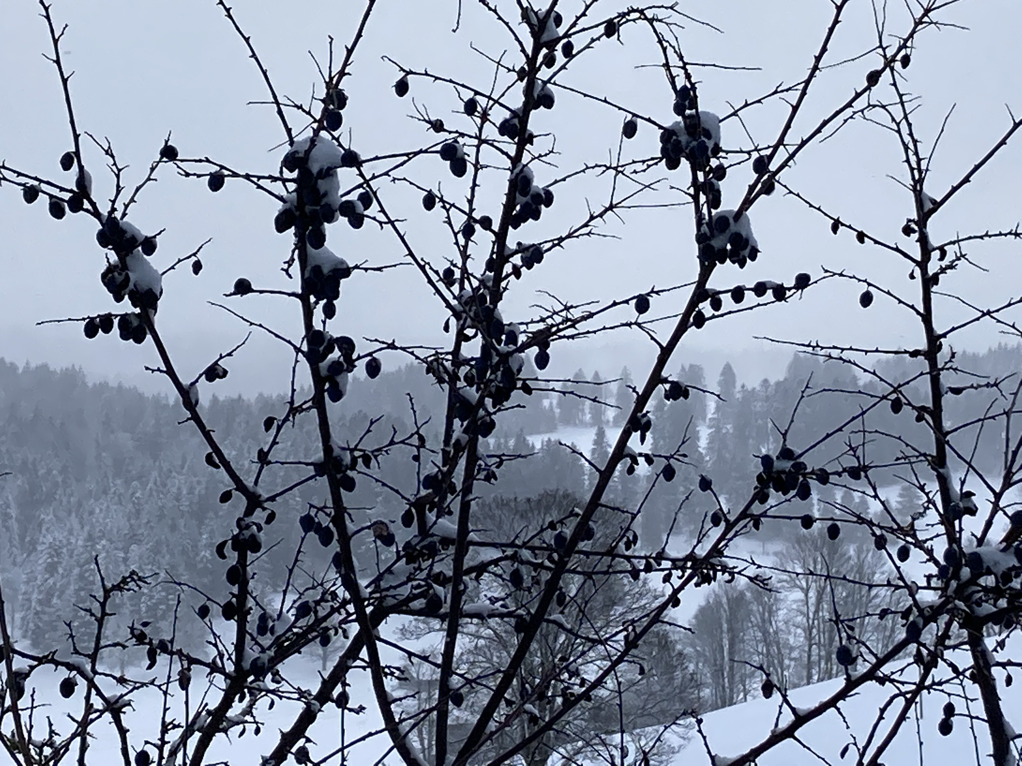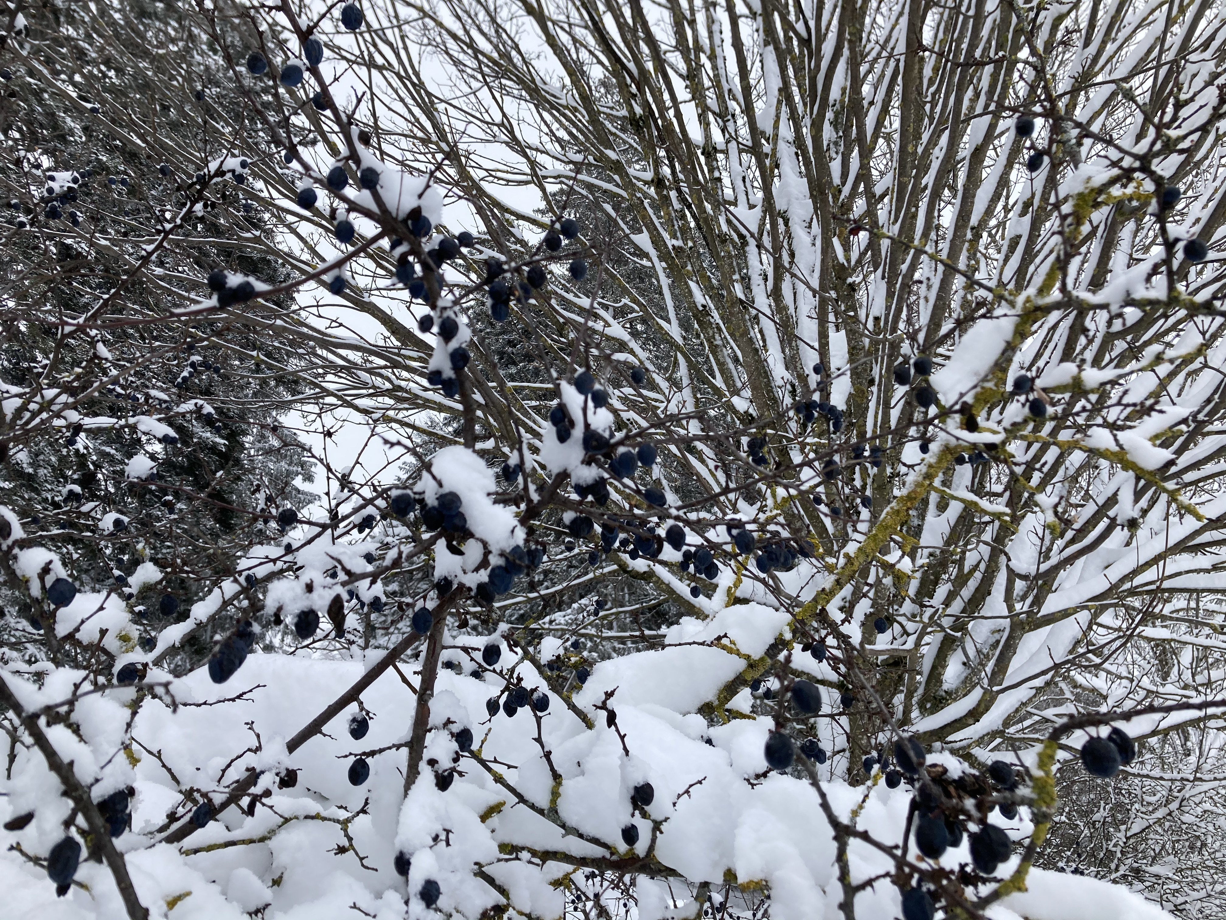 La blosse jurassinne est le fruit du prunelier, appelé aussi épine noire, arbrisseau épineux à fleurs blanches qui fit notre bonheur pendant les promenades du confinement printanier, à un jet de pierre des Jardinets. Très astringente en raison de ses tanins, la prunelle devient plus sucrée à maturité, surtout après la premières gelées, le bon moment pour la cueillir dans la neige avec d’épais gants.