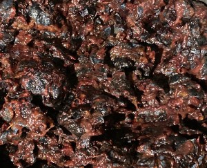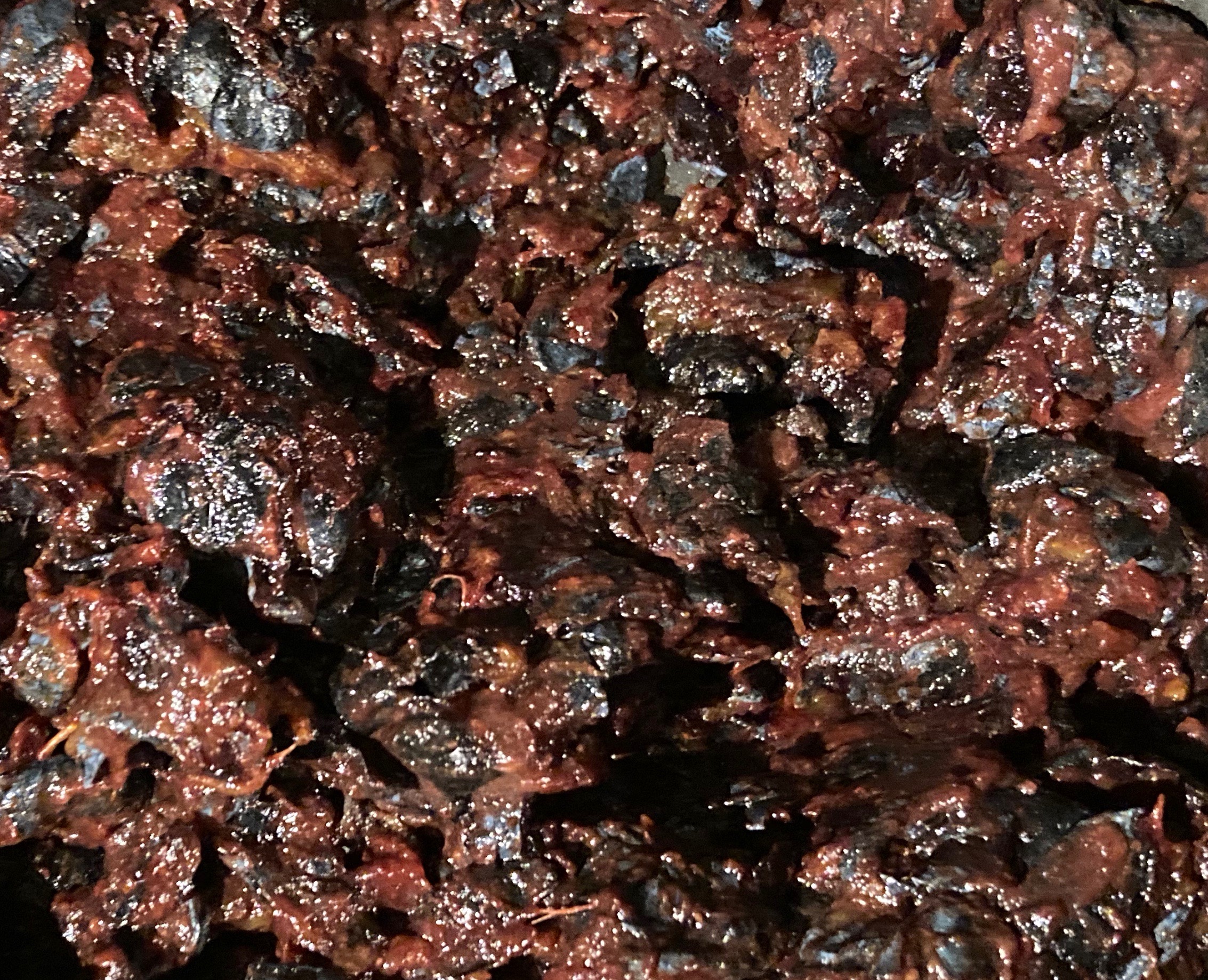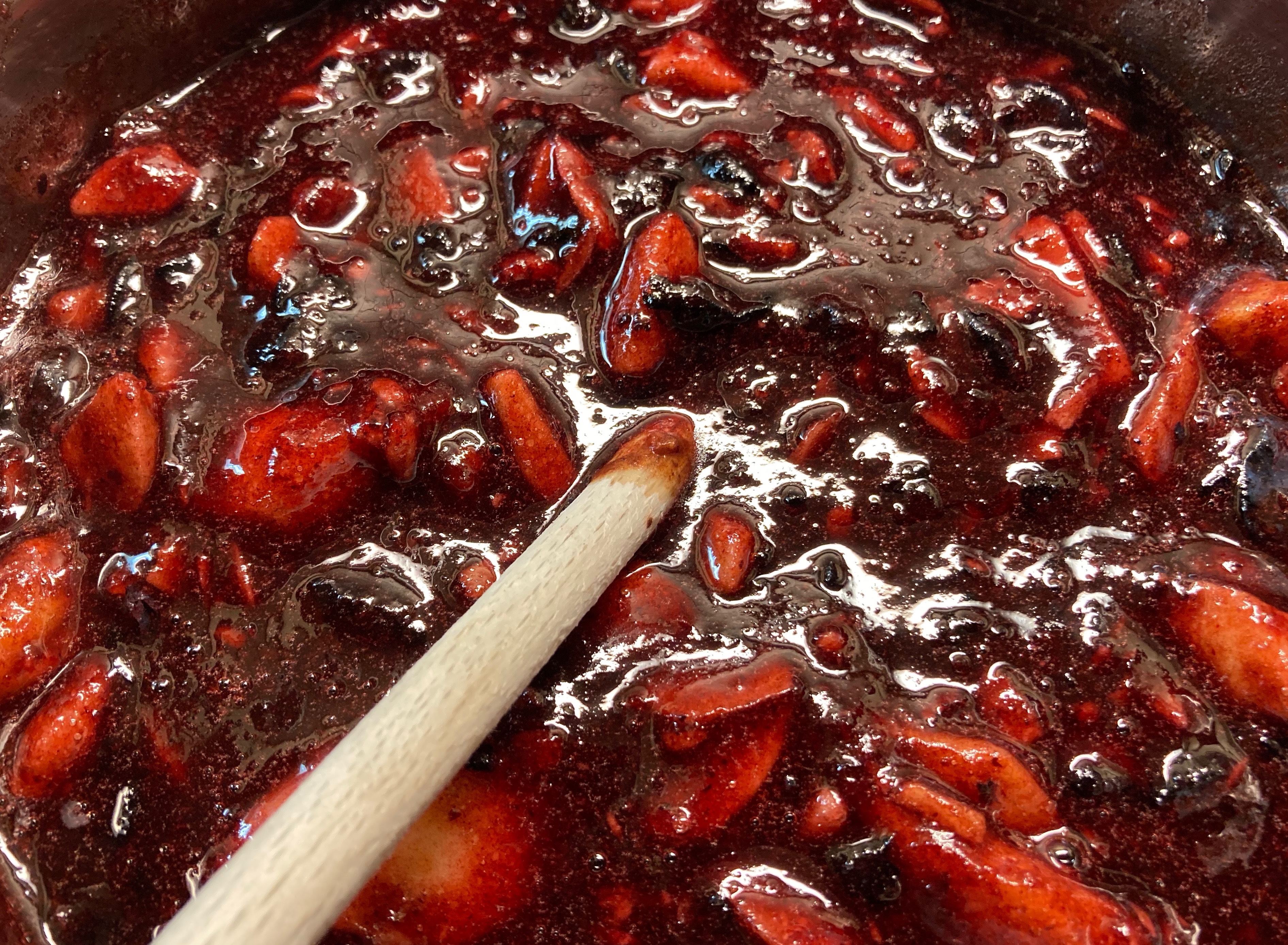 Remercions la nature, qui est notre Dieu, de nous gratifier de ce fruit original. Sitôt cueilli, sitôt dénoyauté après que je suis redescendu sur le plateau de Beau-Site par chez Andreas. Le kilo récolté prendra deux heures à être patiemment libéré de ses noyaux pour former un mélange qui colle aux doigts et à la spatule. J’ai ajouté à la livre qui m’est restée 400 grammes de pommes boskoop, 750 grammes de sucre et 1décilitre de jus de pommes de la Bocarderie.