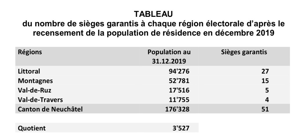 Ainsi selon l’article 44 de la loi sur les droits politiques, le nombre de sièges est garanti à chaque région électorale selon les règles suivantes : la population résidente du canton est divisée par 50. Le nombre entier immédiatement supérieur au dividende obtenu constitue le quotient et chaque région a droit à un nombre de sièges garantis équivalent à sa population de résidence divisée par le quotient, le dividende ainsi obtenu étant arrondi à l’unité supérieure ; chaque région dont la population de résidence est inférieure à 4 fois le premier quotient a droit à quatre sièges garantis, ce qui est le cas du Val de Travers. Les sièges garantis sont attribués à des candidat-e-s domicilié-e-s dans la région électorale concernée.