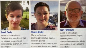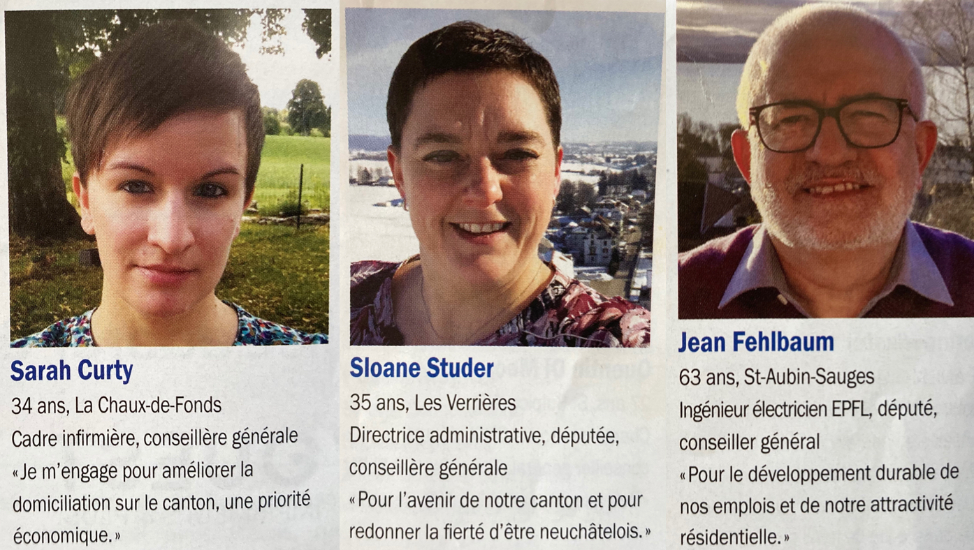 De manière fine, marquante et « efficace », le PLR a mis en tête de sa liste ses vingt-neuf candidates, ce qui les a notablement favorisées puisque nombre d’entre elles ont été réélues (ex. Sloane Studer du Val de Travers) ou élues pour la première fois (ex. Sarah Curty de La Chaux-de-Fonds). Ainsi dix-sept députées ou députées suppléantes du PLR sur trente-sept sont des femmes et cinq seulement ont plus de soixante ans ! M. Fehlbaum en a soixante-trois et est un homme ! Comme tant d’entre nous !