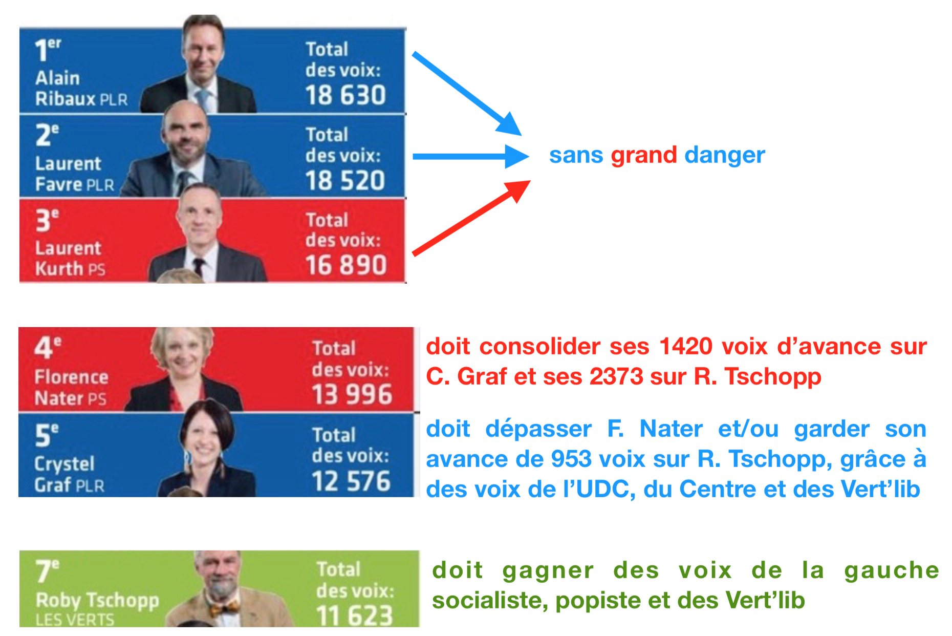 L’avance de MM Ribaux, Favre et Kurth est trop importante pour qu’ils perdent des suffrages d’électeurs qui ont voté pour eux le 25 avril. Les 4314 voix d’avance du socialiste sur la jeune PLR lui garantissent une des cinq premières places.