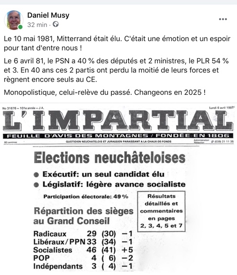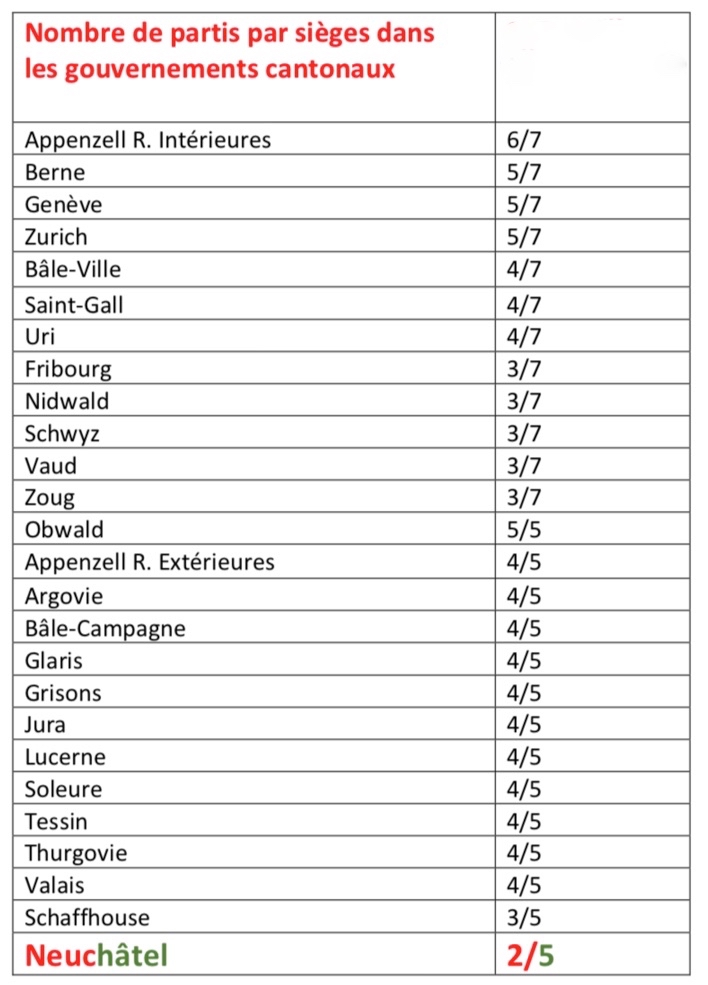 Si le PS et le PLR arrivent dans les prochaines années à regarder en face leurs majorités successives 3-2 depuis 1965 (sauf exceptions avec Michel von Wyss, Fernand Cuche et Yvan Perrin), ils conviendront qu’un débat devrait être lancé sur la possibilité d’élire notre gouvernement à la proportionnelle comme au Tessin.