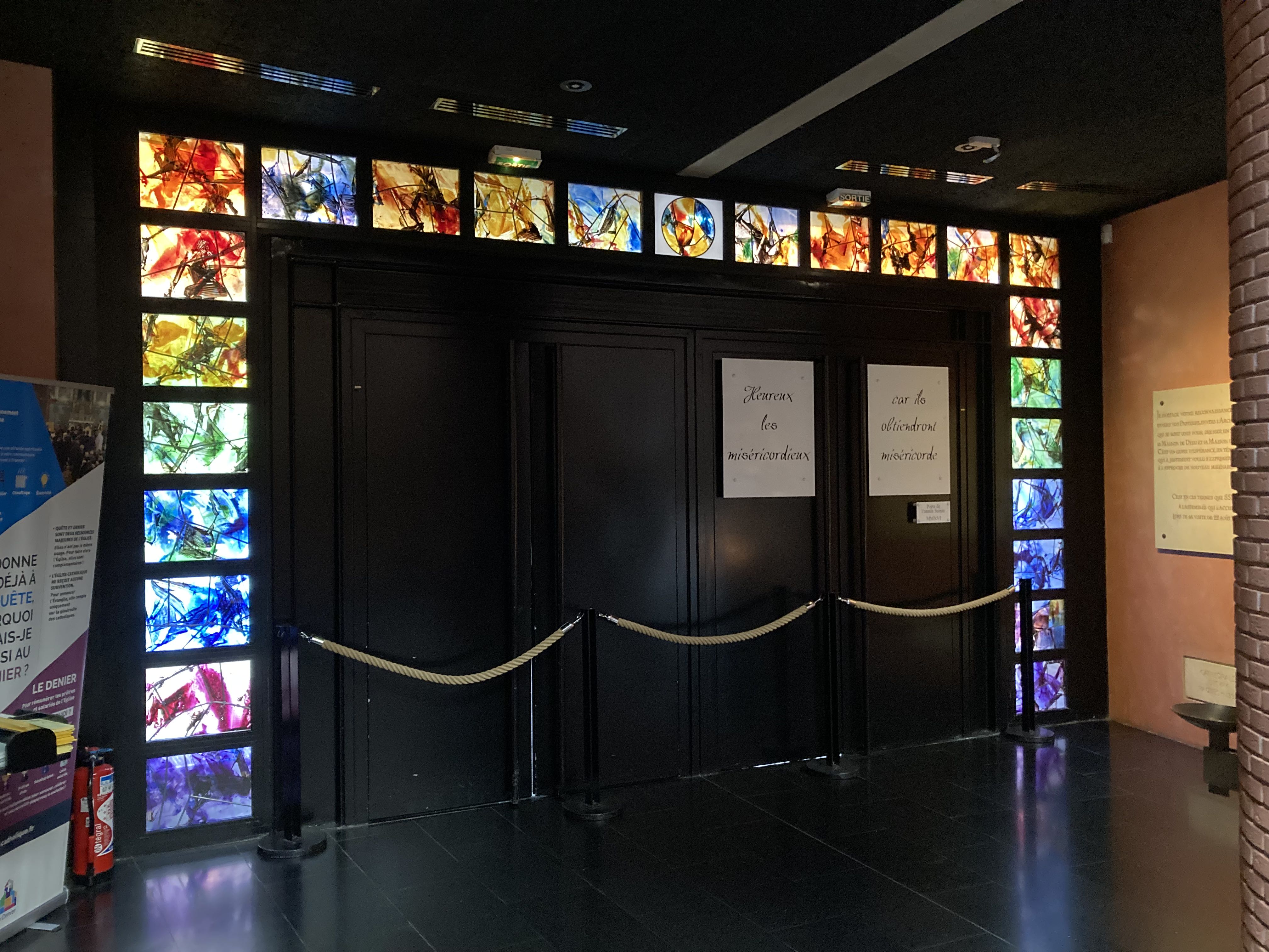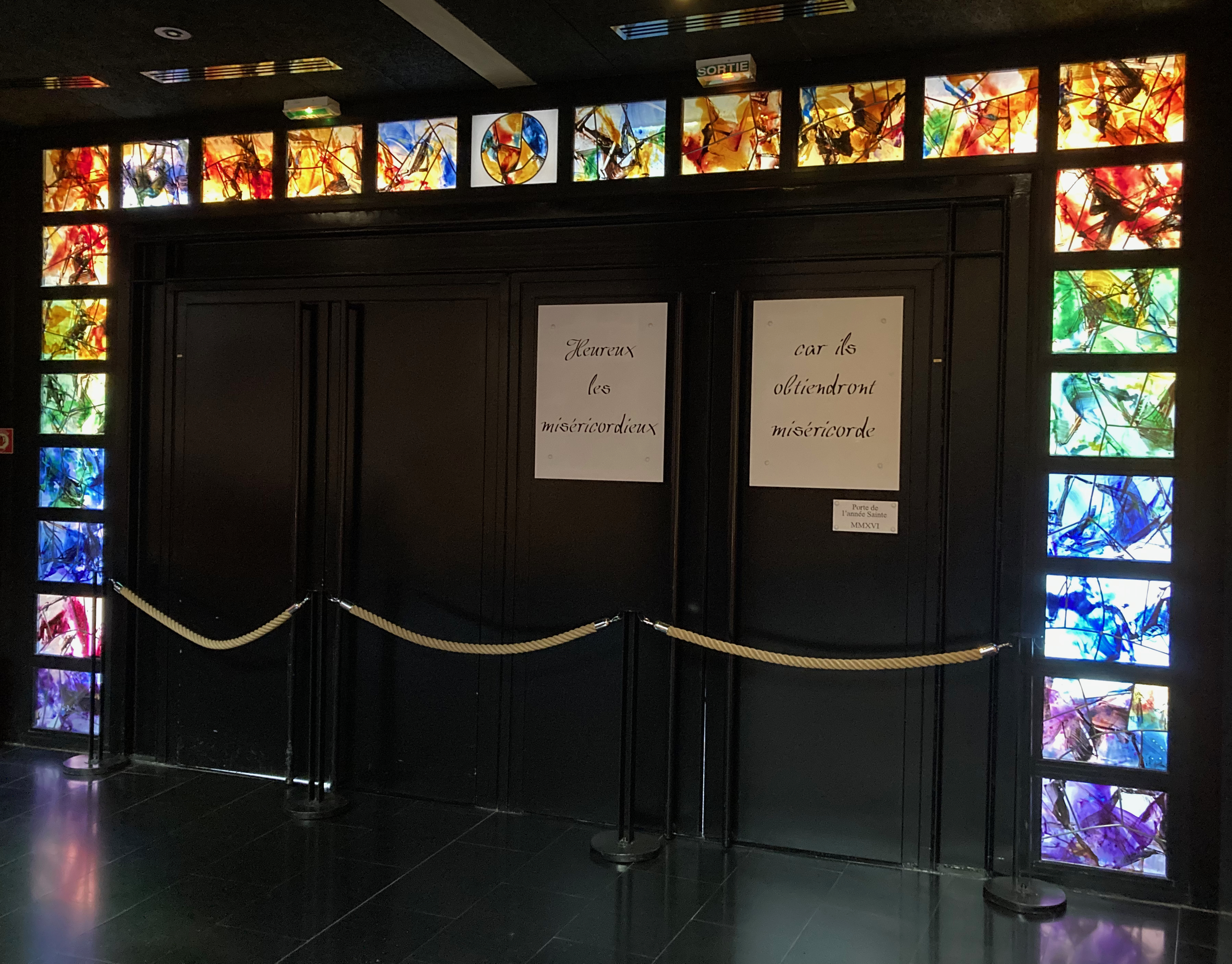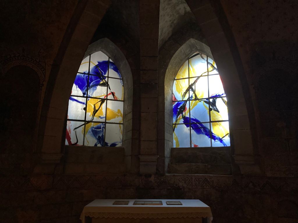 Changement total d’atmosphère par rapport à Evry et sa calligraphie tourmentée. Ici les surfaces colorées sont davantage monochromes; leur plénitude, le geste ample de la main qui a tracé les lignes noires et étalé les couleurs vives et franches sied à cet endroit serein dans le bruit de la cité. Un lieu ouvert à tous, même aux athées…